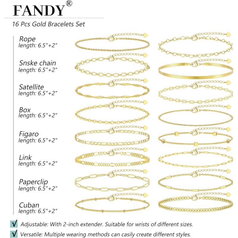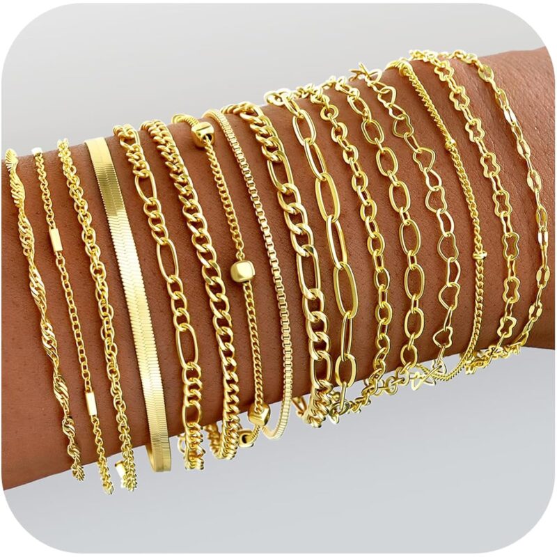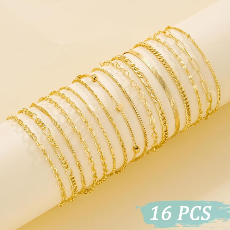 - Gold Bracelet Set: You will receive16 dainty gold bracelets in individual styles. Our gold bracelets for women trendy include cuban chain, rope chain, paperclip chain, figaro chain and heart chain etc. These bracelets are suitable for layering as well as being worn alone. Creating varioyles and highlighting fashion and elegance.