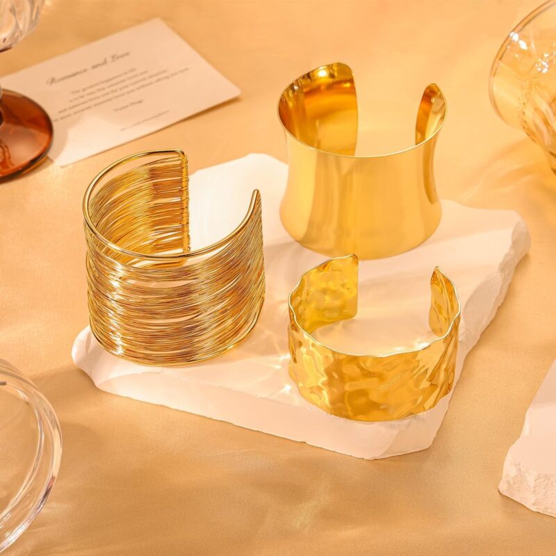 - Gold Bangle Bracelets: This set of 3 chunky gold cuff bracelets adds an edgy yet elegant touch to any outfit with their irregular minimalist open design.