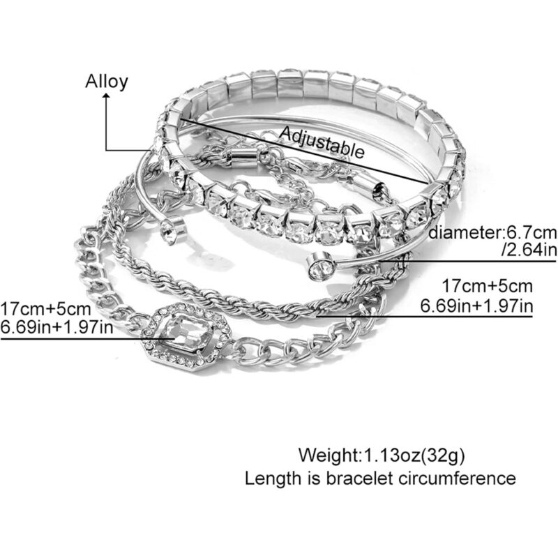 【Design】: 4 Pcs include a simple bangle, shiny crystal elasticty hoop, big diamond chain and twist bracelet, Complete your jewellery collection box.