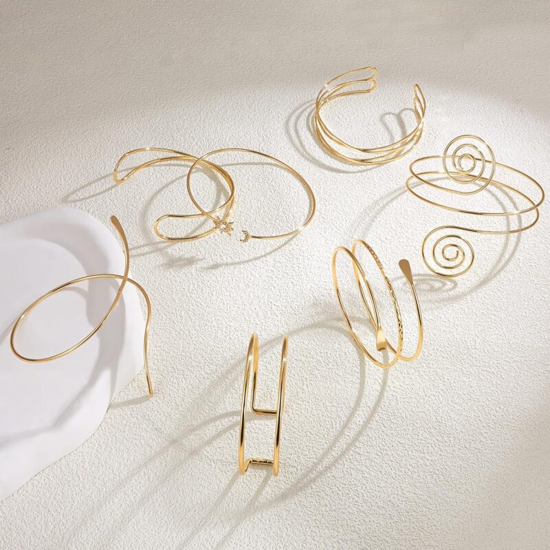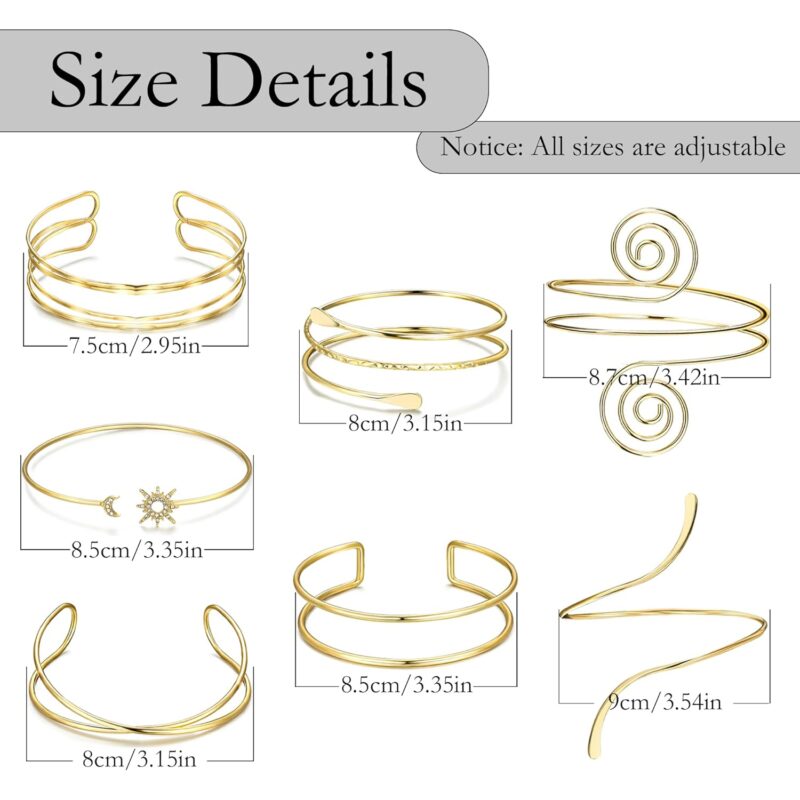 - Arm Cuff Jewelry for Women: Our arm jewelry set includes sun moon arm cuff, minimalist arm cuff, swirl arm cuff, coil arm cuff bracelet, layered arm bangle, wire arm bracelet and open arm cuff. The arm jewelry upper arm makes you charming