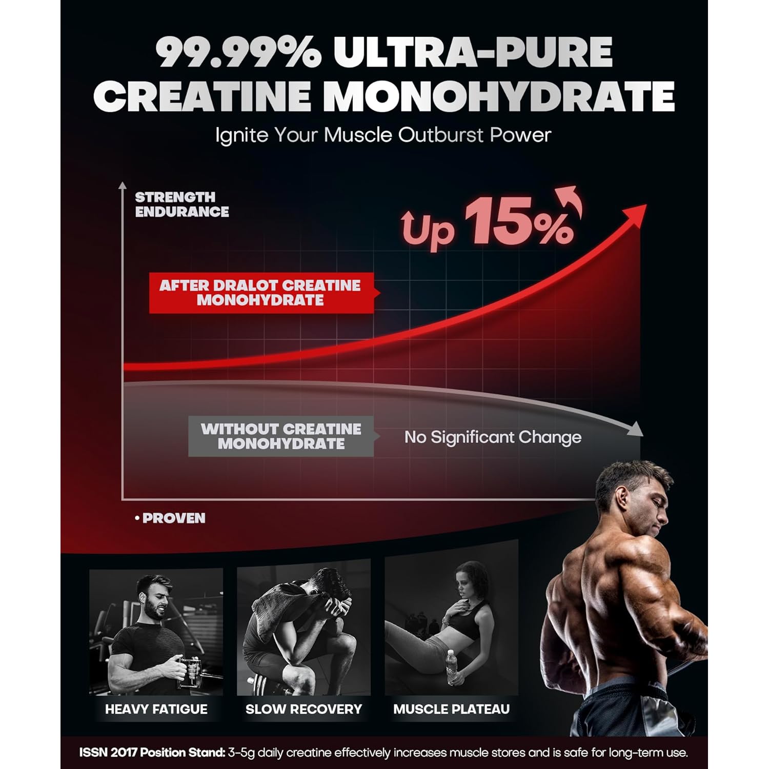- 99.99% ULTRA PURE CREATINE MONOHYDRATE, NEXT-LEVEL MUSCLE SUPPORT! Tired of energy run-down, muscle plateau, and long recovery? Compared to other creatines, our Creatine Monohydrate is refined with ultra-fine mesh technology, which can accelerate ATP regeneration by 200%, ensuring faster absorption and maximum muscle growth. Crush your limits with Dralot Creatine Monohydrate Gummies! Say goodbye to slow progress and hello to explosive strength, lightning-fast recovery, and unstoppable endurance!