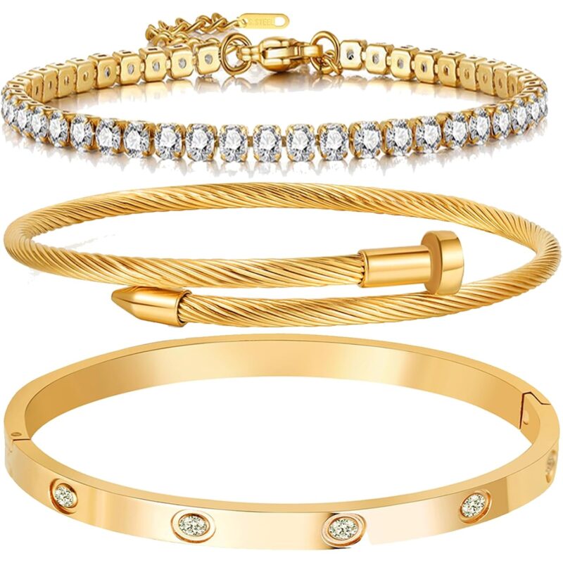 - MINIMALIST DESIGN – Gold love bangle bracelet set, A simple and exquisite gold tennis bracelets set. Each love bracelet can be worn seperately or together for a layered look with other chains. A set of miniature chain gold bracelet stack for women and gold love bangle can provide more choices for your varied clothing matching.