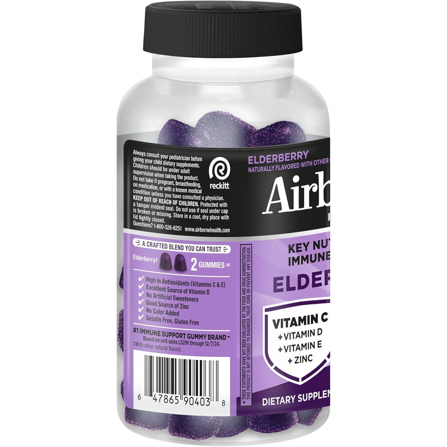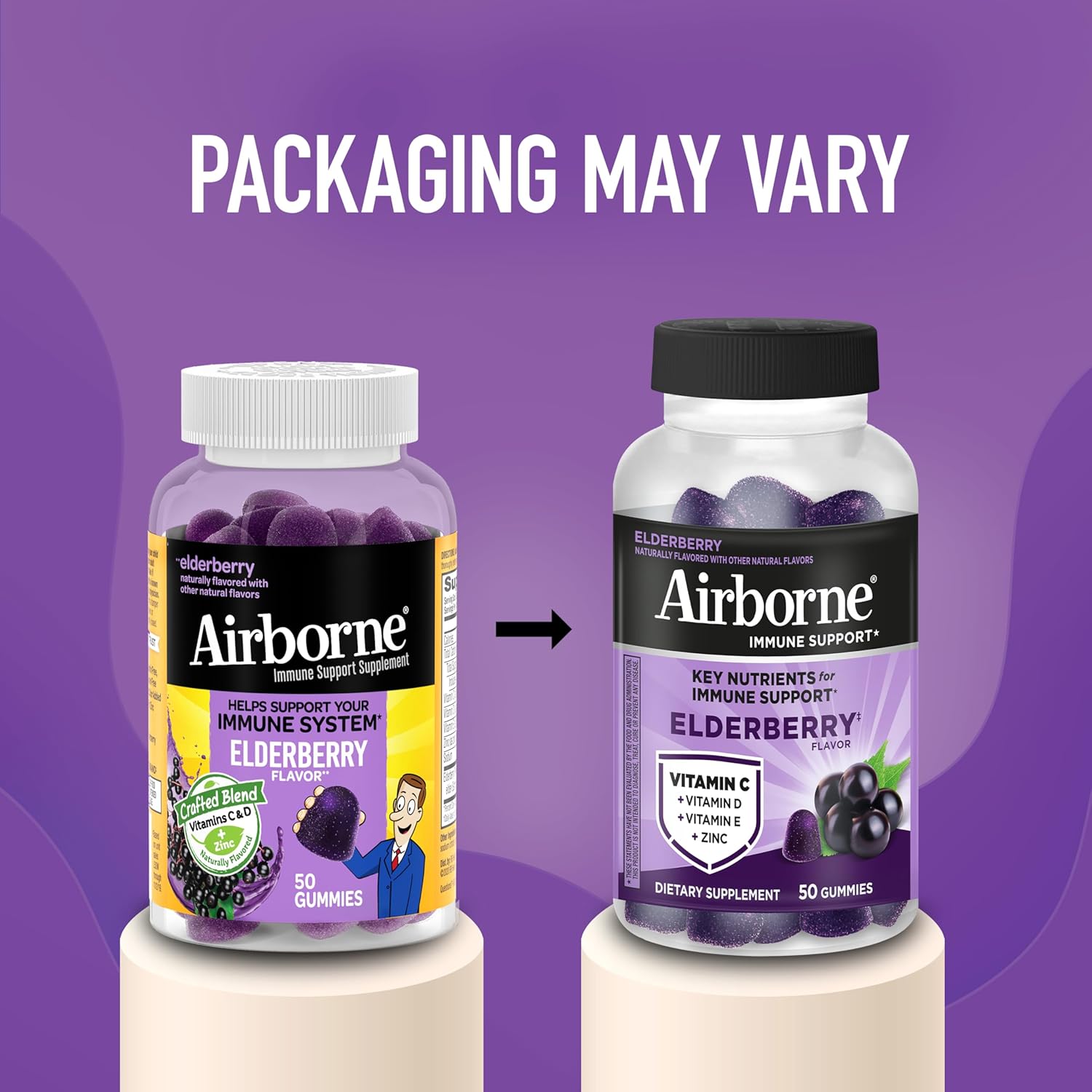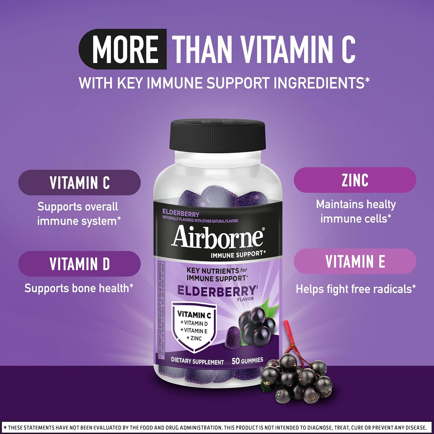 Airborne Elderberry + Zinc & Vitamin C Gummies For Adults, Immune Support Vitamin D & Zinc Gummies With Powerful Antioxidant Vitamins C D & E – 50 Gummies, Elderberry Flavor