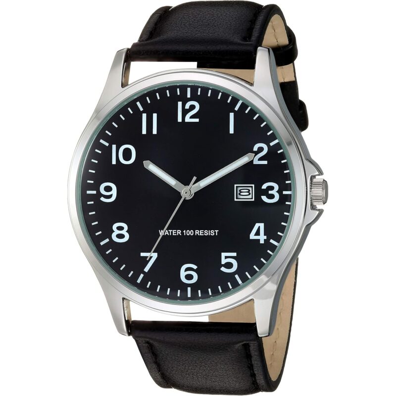 - DETAILS: Matte black dial with silver tone luminous hands and easy to read white Arabic numerals; printed outer minute track; date calendar window at 3 o’clock