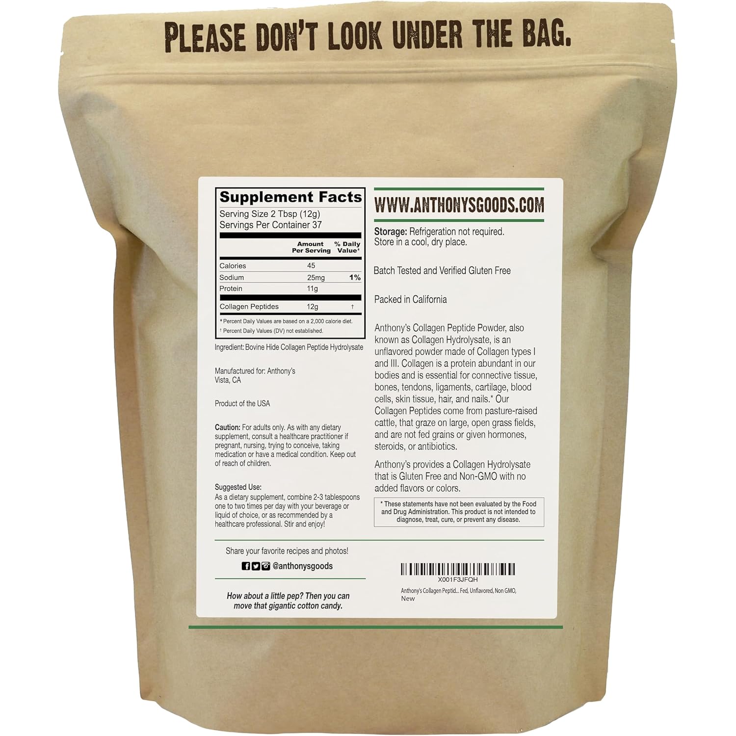 Anthony’s Collagen Peptide Powder, 1 lb, Pure Hydrolyzed, Gluten Free, Keto and Paleo Friendly, Grass Fed, Unflavored, Non GMO