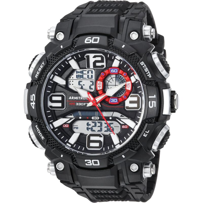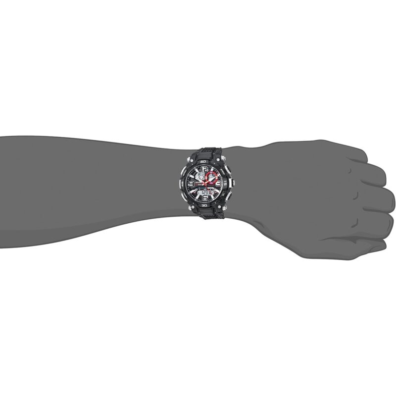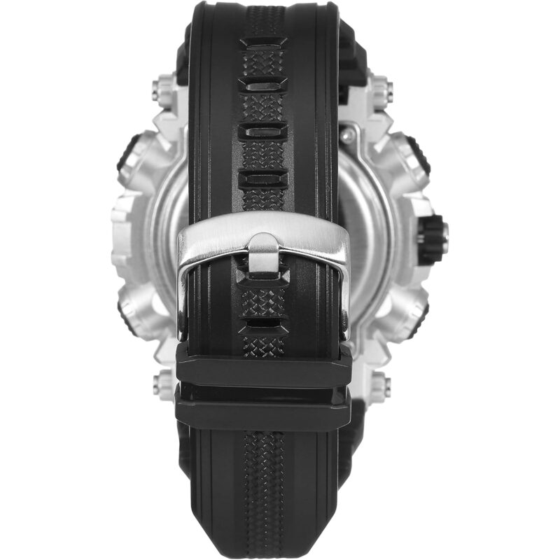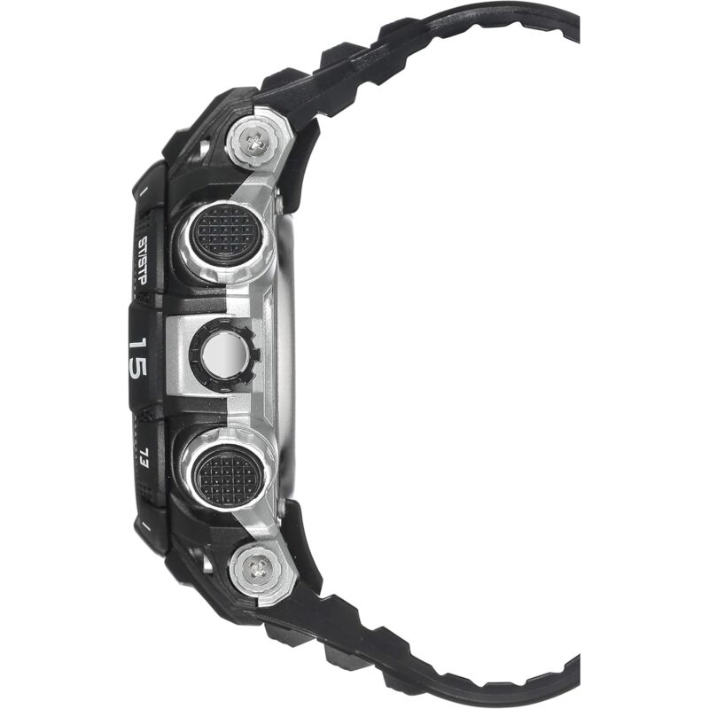 - Metallic grey resin case with black textured top ring; analog digital display with time, seconds, day and date; black resin strap with buckle closure