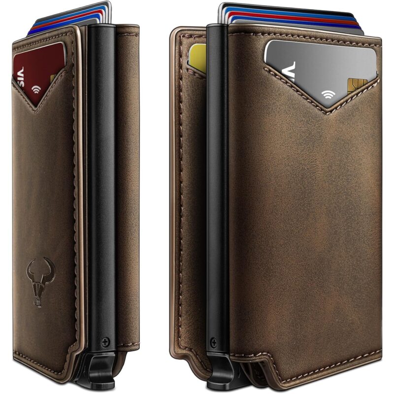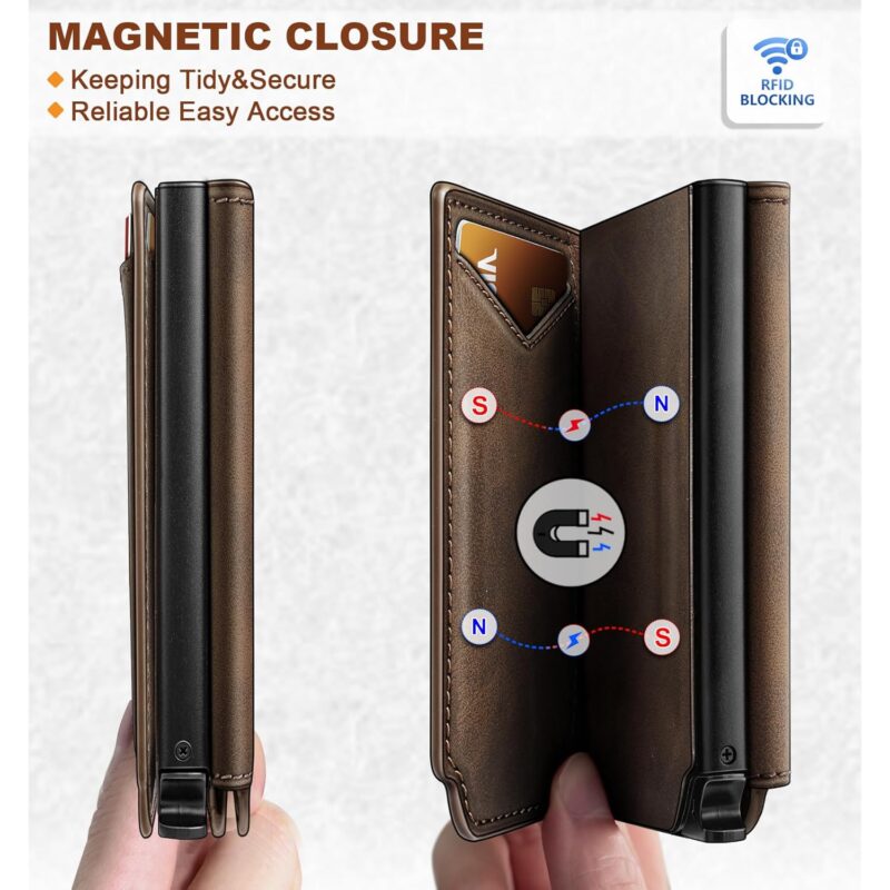 - REFINED STRUCTURE–The exterior card slot provides easy access to your everyday cards, while the flip page contains a convenient bill compartment. The pop-up card structure allows you to retrieve your cards effortlessly with a simple press of the button. Each function is thoughtfully placed for maximum convenience;