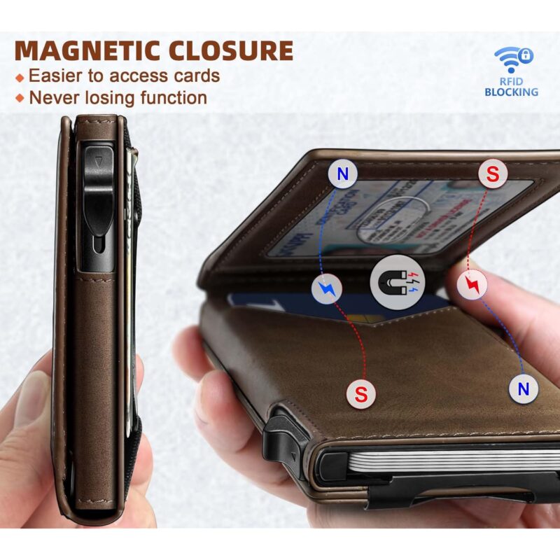 - CAPACITY-Pop-up metal Case in flipping leather shell,9 card slots (including 1 ID window) and metal money clip for couple of bills;