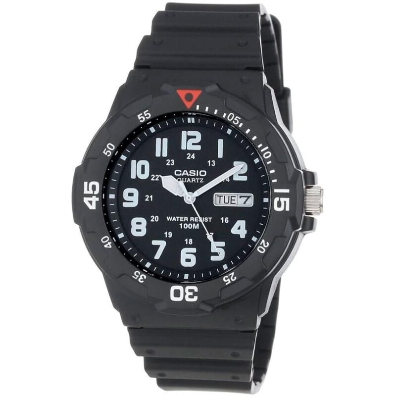 - 12/24-hour timekeeping, 43 mm resin case with mineral dial window, Japanese quartz movement; Analog: 3 hands (hour, minute, second)