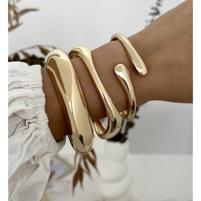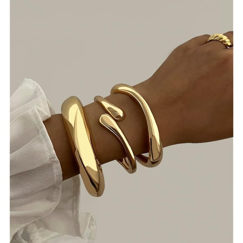 - Gold Statement Bracelets: This stackable bracelet with minimalist design, simple and generous style, very with blouses, suits and other simple wear wear, but also with dresses and bohemian style, is a very fashionable women’s jewelry items, you can rest assured to wear.