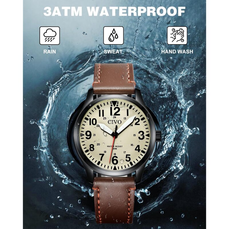 • Waterproof Protection: With a 30-meter water resistance rating, the mens watches can handle sweat, rain, and splashes from washing your hands. It’s perfect for everyday wear and outdoor activities but not suitable for swimming, showering, or exposure to hot water.
