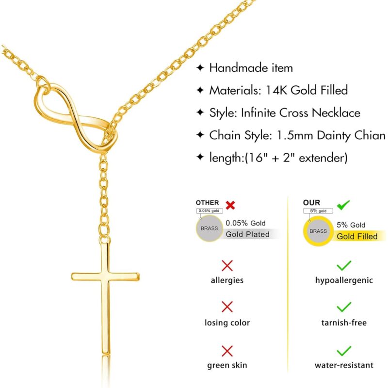 - This beautiful infinity christian necklace with cross is made of high quality 14K Gold Filled. Nickel-free, Lead-free, Cadmium-free and hypoallergenic. no tarnish, or lose it’s colour.