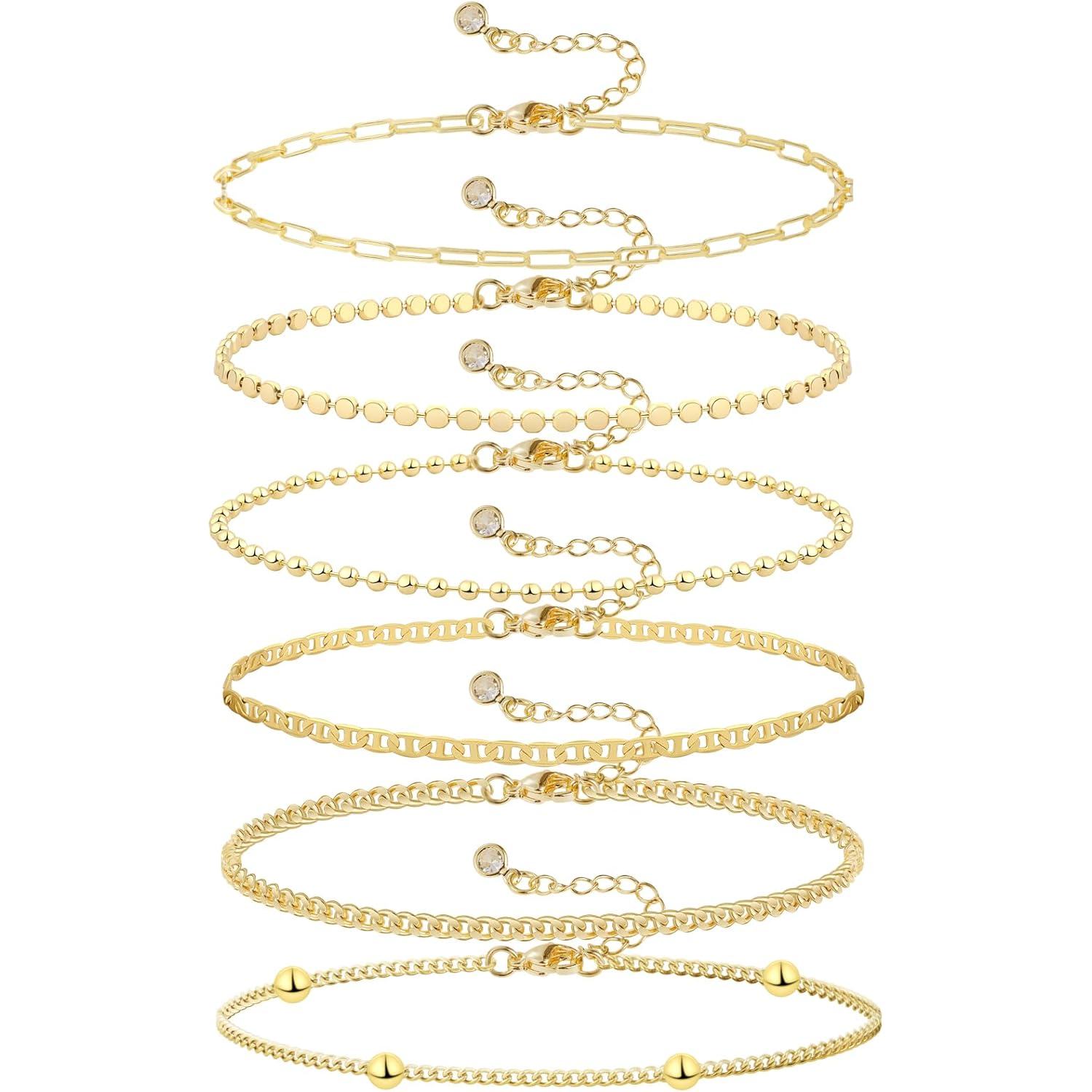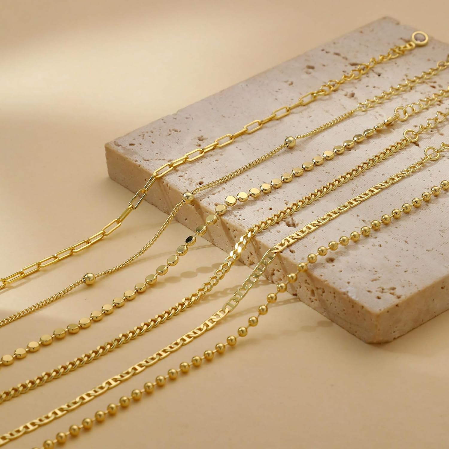 - 6 Pcs Gold Bracelets Set: Cuban chain, Gold Bead Chain, Paper Clip Chain, Interval Gold Bead Chain, Flat Bead Chain, Horsebit chain. These bracelets are suitable for layering as well as being worn alone