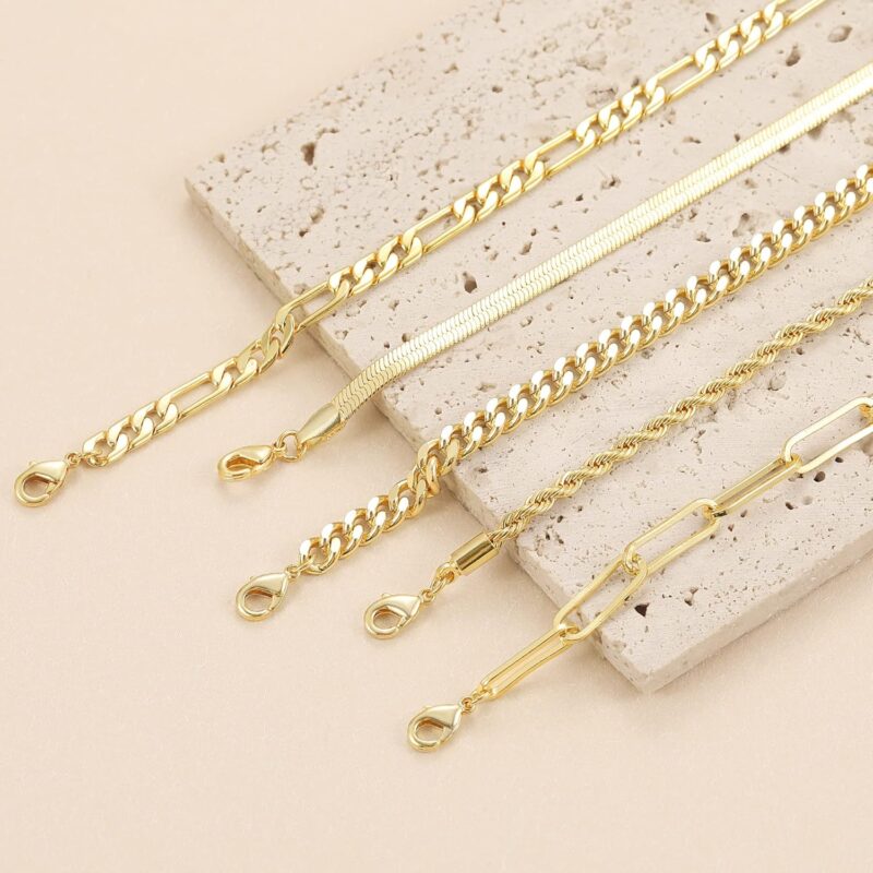 • Alluring 5-Piece 14K Gold Plated Bracelets Set: Includes Figaro Bracelets, Cuban link Bracelets, Herringbone Bracelets, Paperclip Bracelets, and Rope Bracelets. Ideal for layering or individual display, showcasing elegance.