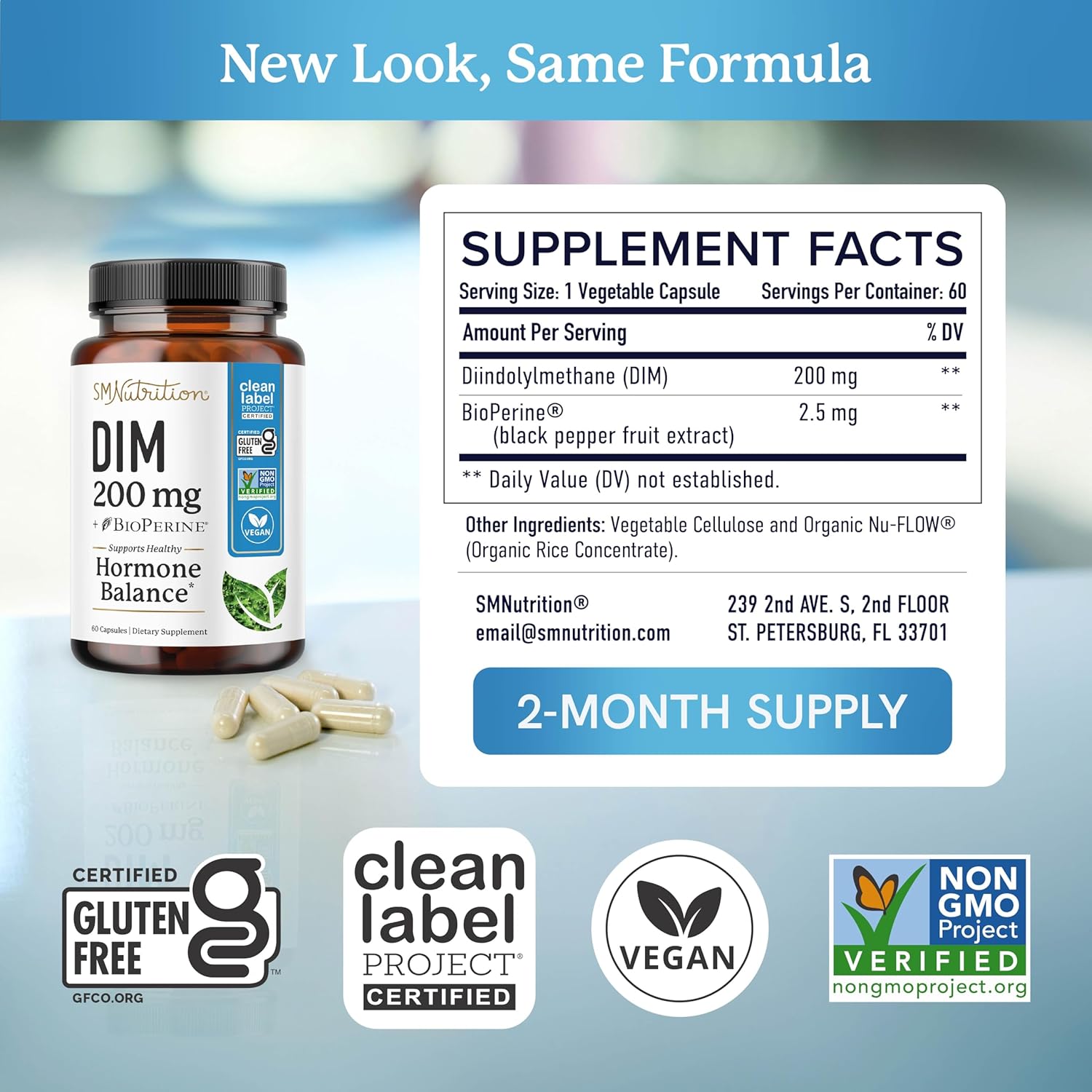 • OVER A MILLION USERS FOR A REASON: DIM plus BioPerine by SMNutrition is the number one DIM supplement on the market for a reason. DIM 200 is Clean Label Project Certified, Non-GMO Project Verified, Vegan, HALAL Certified, Gluten Intolerance Group Certified, Soy-Free, Dairy-Free, Titanium Dioxide-Free, Silicon Dioxide Free, and formulated without the top 9 allergens. Active ingredients are verified by third-party testing. It is manufactured in a facility that is certified GMP compliant with NSF standards.