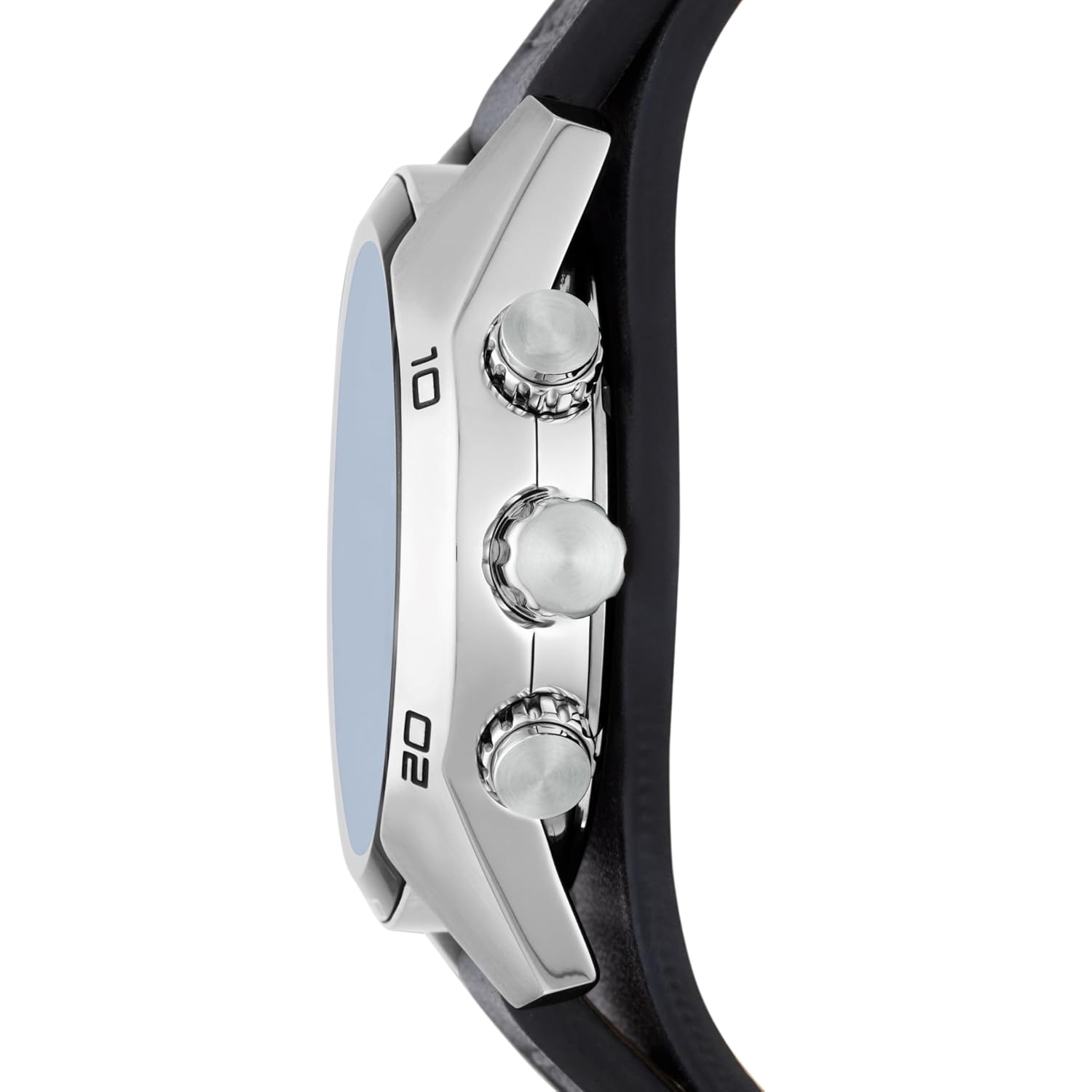 - VERSATILE STYLE: Go casual with this stainless steel watch. The silver dial features a blue crystal lens, and chronograph movement adds functionality. A black genuine leather strap with silver-tone studs gives this watch for men a sporty look.