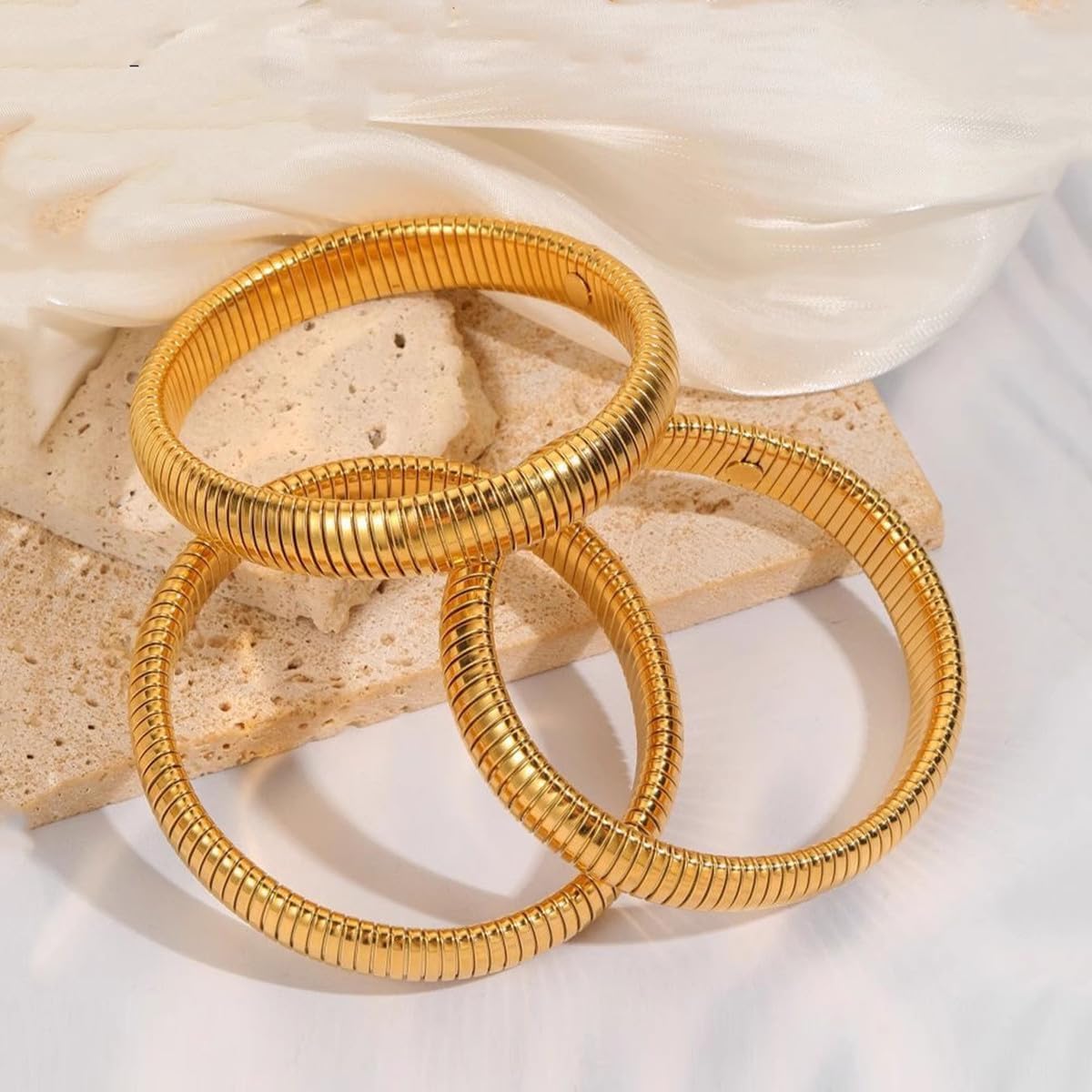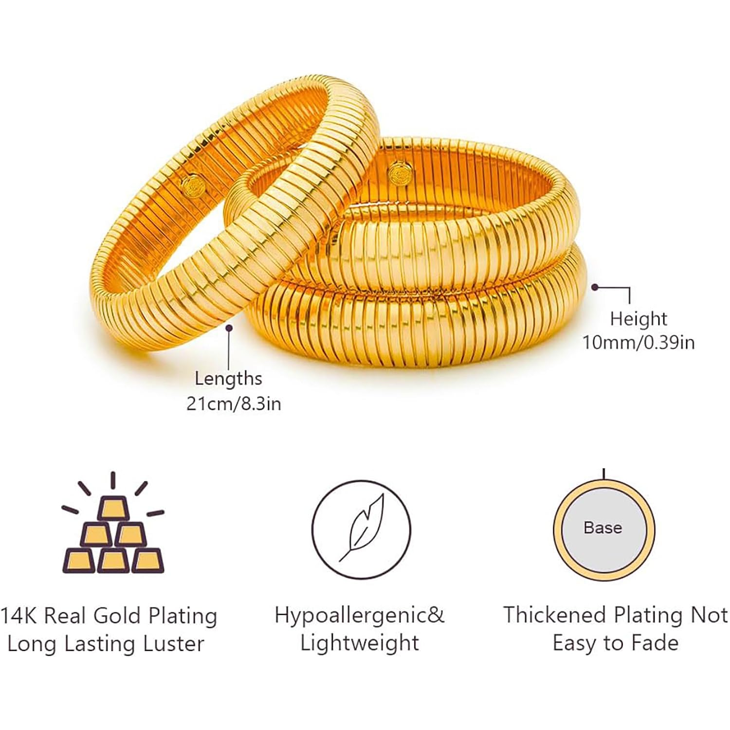 Gold Bangles for Women Set of 3 Chunky Stretch Bangles Bracelets 24K Gold Plated Stainless Steel Bracelets Flexible Wide Stack Bracelets Designer Look Alike Jewelry for Women