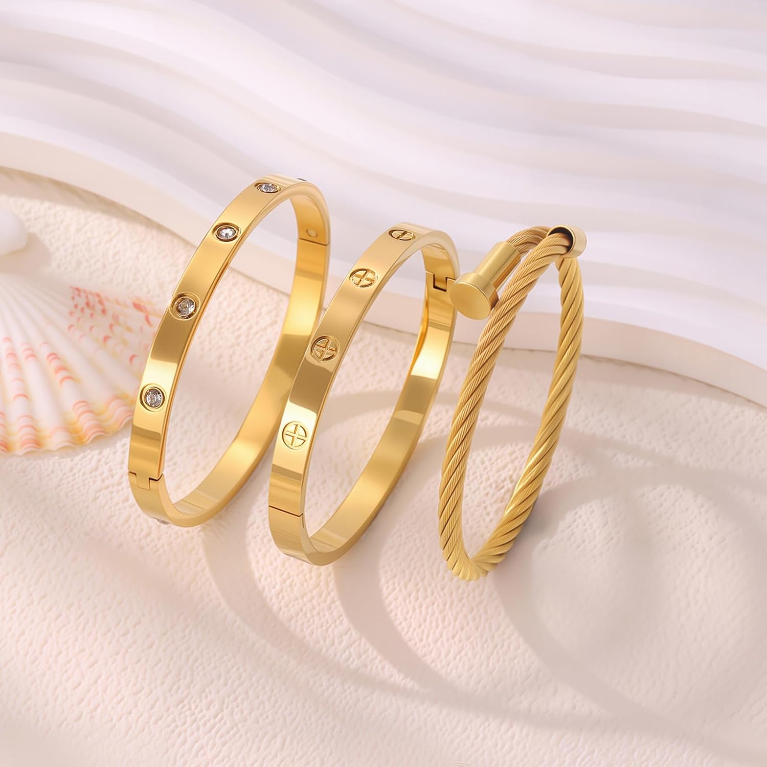 - MINIMALIST GOLD BRACELET SET : Includes exquisite gold love bangle, friendship bracelet, and nail bracelet, all crafted with a simple yet elegant design. Each piece can be worn alone for subtlety or stacked with other chains for a trendy layered look, providing abundant choices to match your varied outfits.