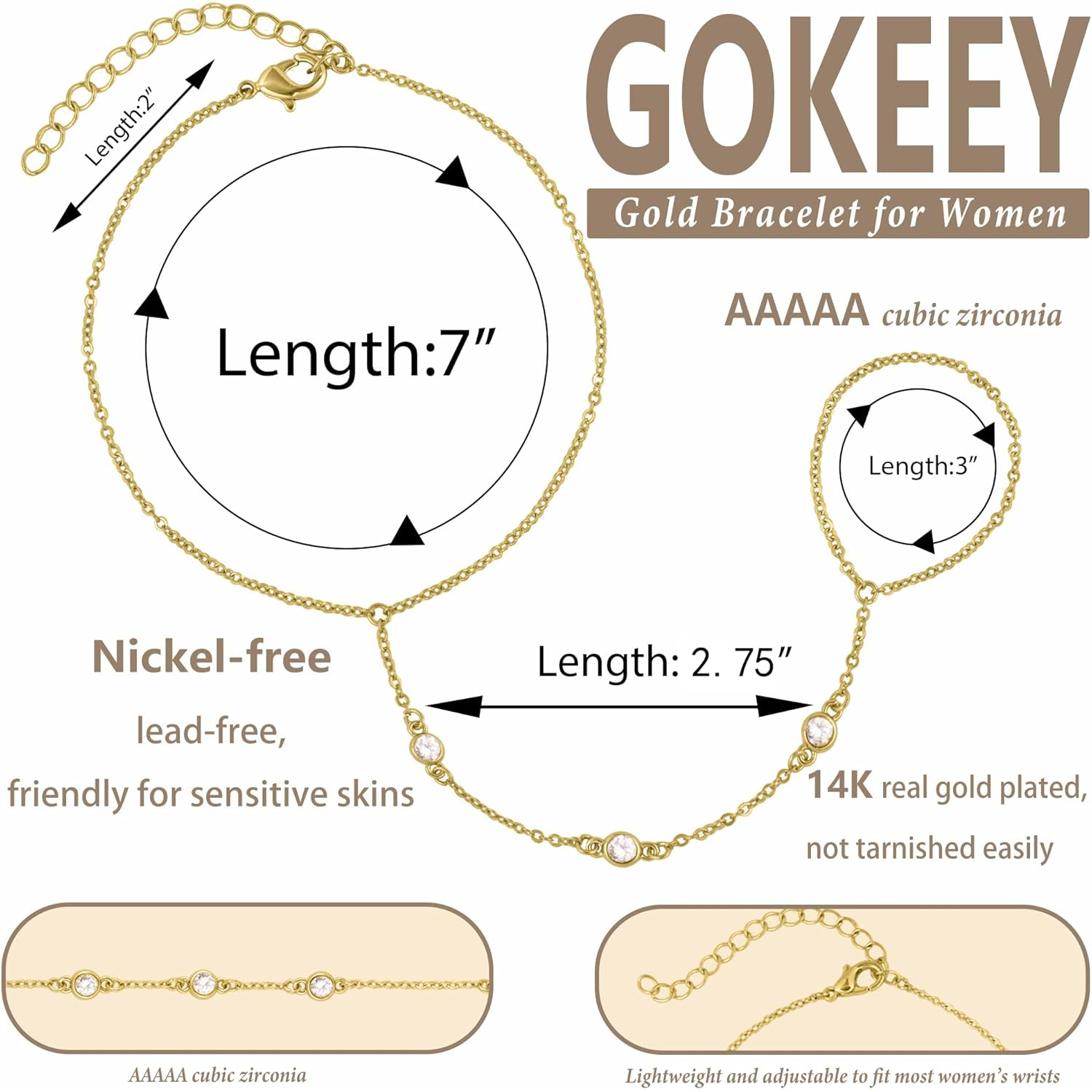 - Adjustable Ring Bracelet Hand Chain:Adjustable gold bracelet from 7″ to 9″, with dainty cz diamond stones, and 2 “Extended Chain.With a flexible and considerate design, this hand chain is easy to adjust, so you don’t have to worry about the size.