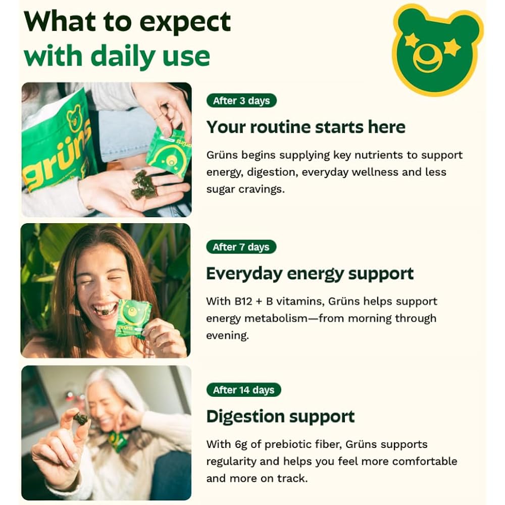- NO MESS, NO STRESS: Grüns is thoughtfully formulated to be a delicious and seamless addition to your daily routine with our convenient individual snack packs. Each pack contains tasty gummy bears so there’s no more cobbling together handfuls of supplements. Enjoy the delightful flavor and benefits of our comprehensive nutrition gummies anytime, anywhere. 28 daily packets for an easy use, on-the-go, and mess-free comprehensive nutritional snack. Enjoy one easy pack per day!