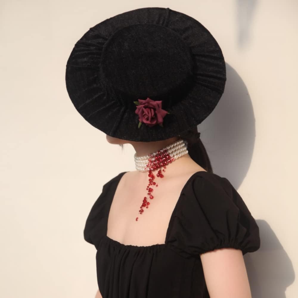 - The overall style of this necklace can be described as unique, edgy, and Gothic, with its dripping blood imitation pearl design perfect for Halloween or vampire-themed costumes. The necklace looks beautiful and realistic, with the blood drops adding a fun and creepy touch, which aligns with the vampire costume theme