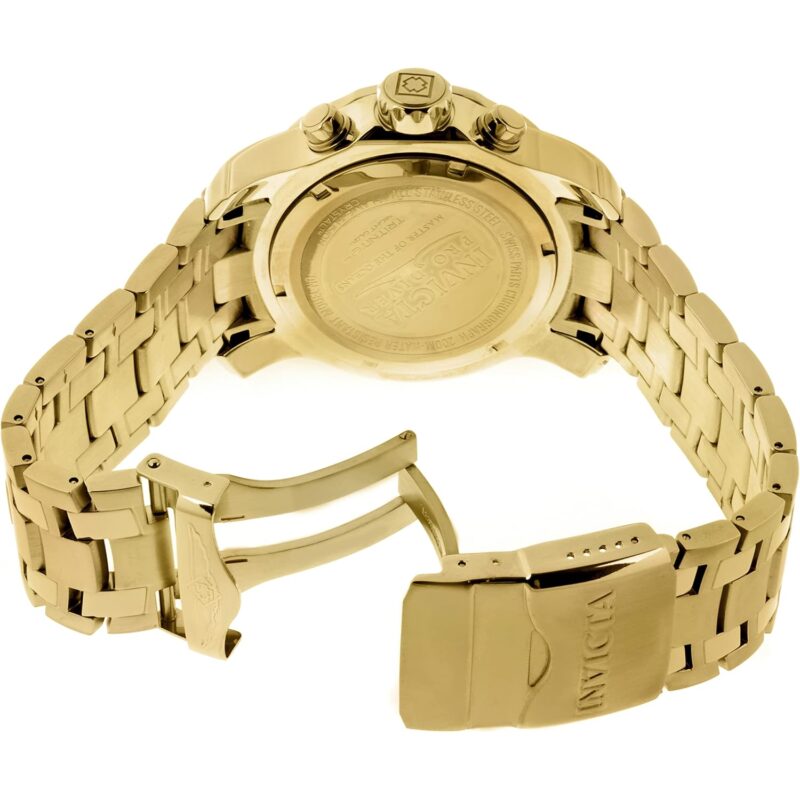 - Gold tone stainless steel band, 215mm L x 26mm W; Band is adjustable by adding/removing links; Fold over safety clasp