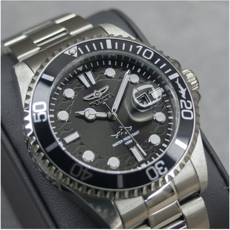 - Stainless steel case 43mm diameter x 12mm thick; Black dial; Luminous hands and hour markers
