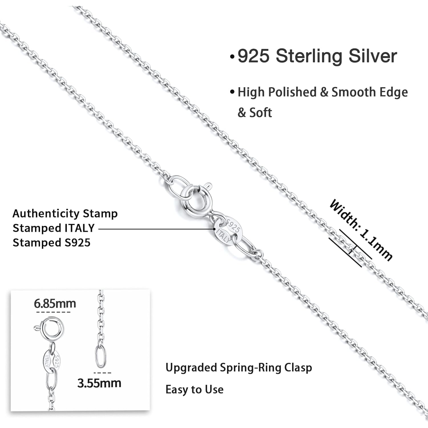 - Thin But Sturdy: Super thin width of 1.1mm, really delicate and elegant looking, high quality material adopted and compact links on the chain to ensure this thin silver chain is sturdy enough and would not break easily. Upgraded spring-ring clasp adopted, making it stronger and more durable. With exquisite polished by skilled craftsmen, this silver necklace chain is soft, to lay comfortably on your collar bone and perfect for everyday wear.