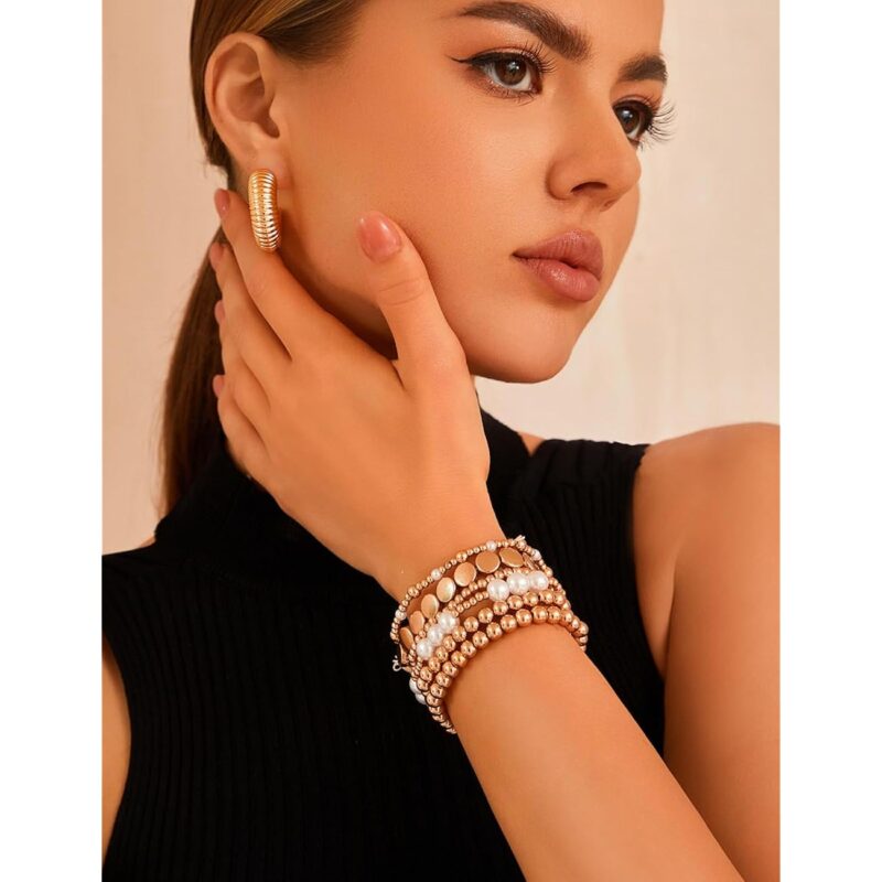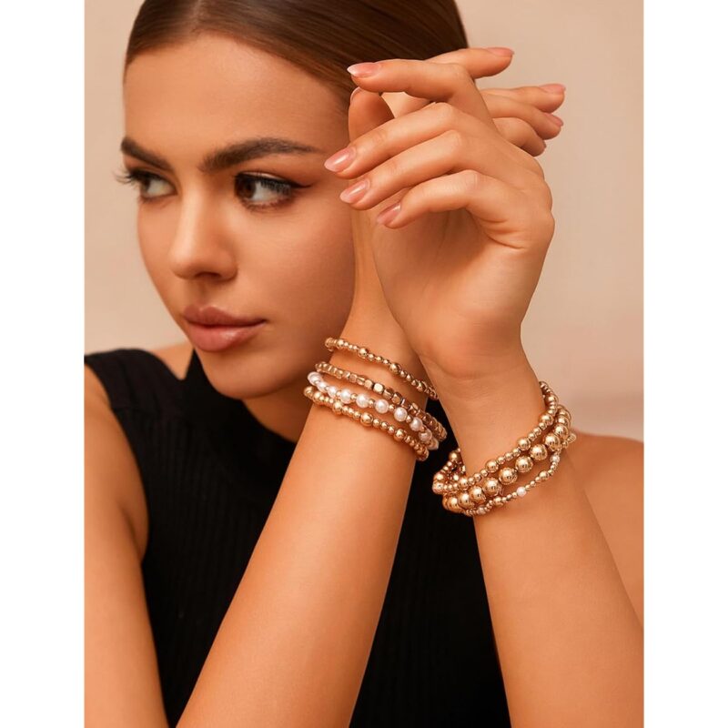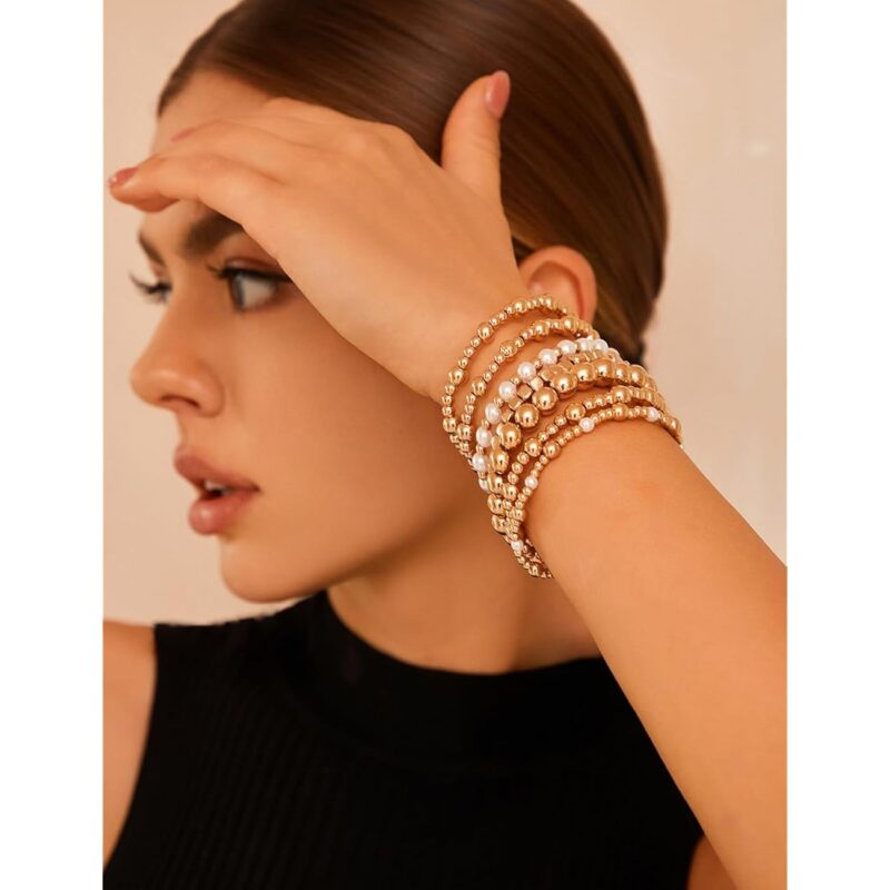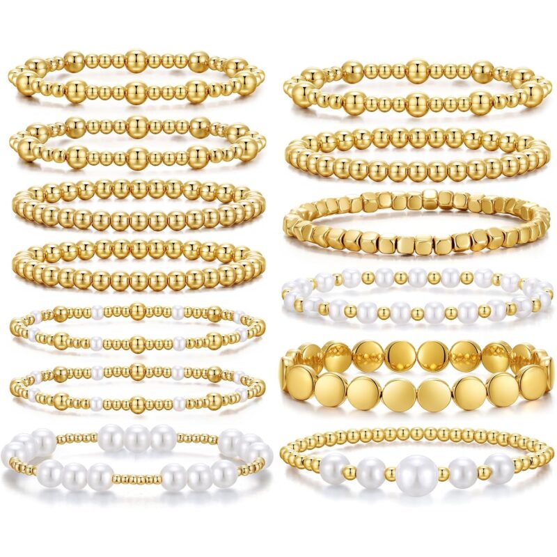 - WOMEN’S GOLDEN BEAD BRACELETS: A set of 13 bracelets made of golded beads and pearls, each golden bracelet can be worn alone, together, or in combination with other bracelets to create your own style