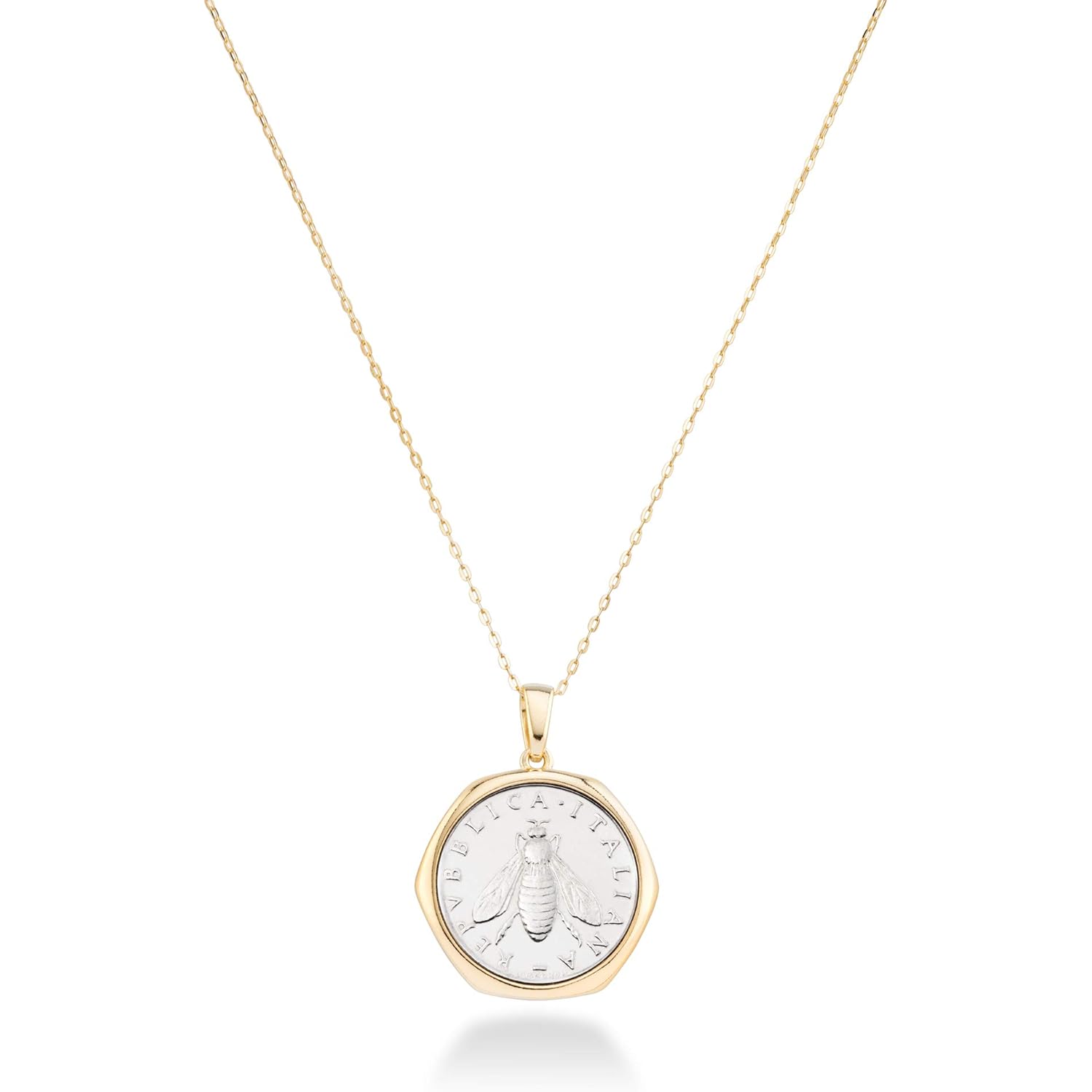 - Retro Glam: Celebrate an enduring symbol of personal power and community with a unique Italian sterling silver medallion necklace. The pendant showcases an authentic 2 Lira Bee coin with a geometric hexagon frame inspired by the classic honeycomb. Minted in Rome from 1953-1959, 69-70, 80-2001 the vintage coin is restored to its original state. A beautiful, everyday necklace to wear solo or layered with other chains to make a statement. Two-tone color is versatile with 18K gold plated silver jewelry.