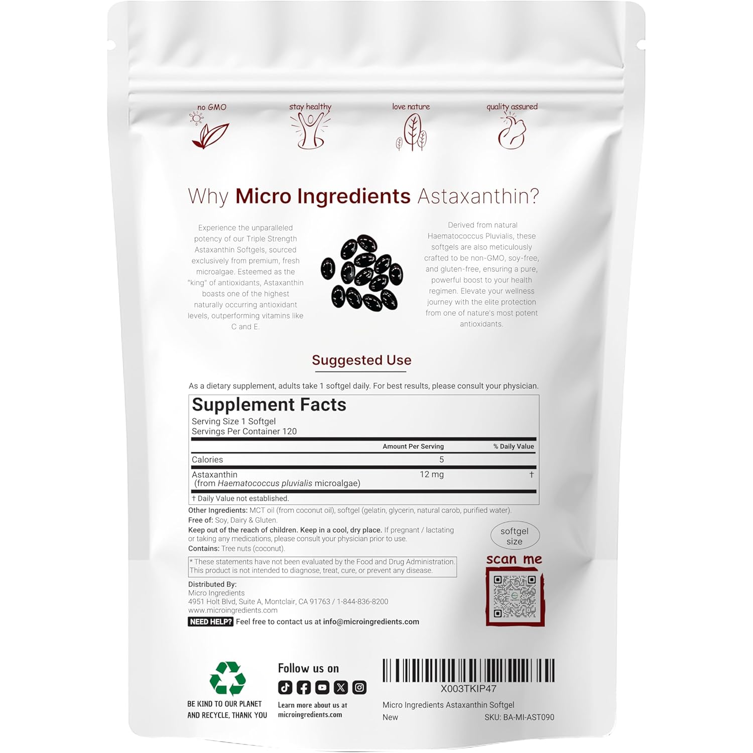 • Premium non-GMO Astaxanthin supplement. Made without soy, dairy, gluten, preservatives, flavors, and tree nuts. Ingredients must pass our 3rd party lab tests to ensure a product that is safe, pure, and potent.