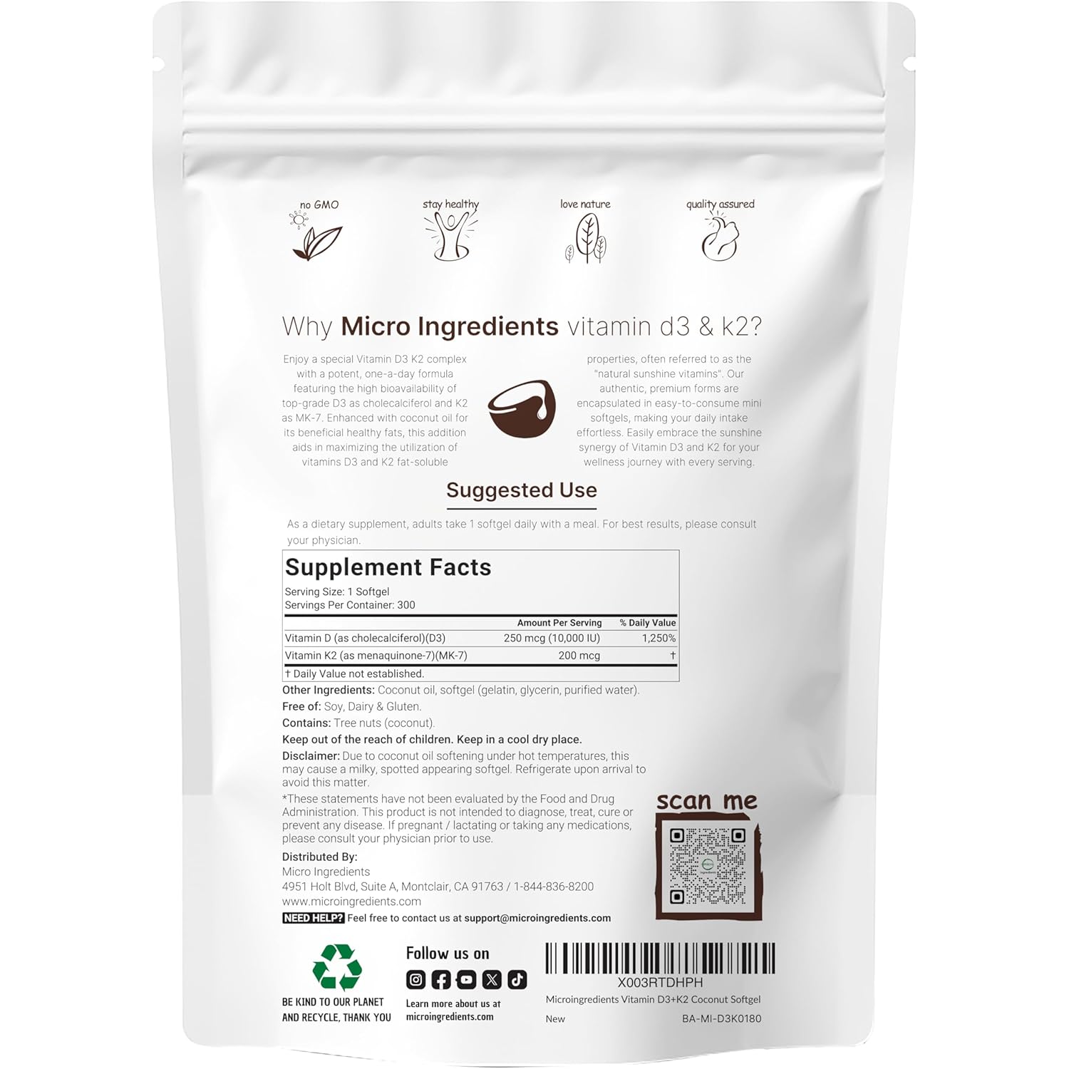 Micro Ingredients Vitamin D3 10,000 IU + K2 MK-7 200 mcg, 300 Softgels with Virgin Coconut Oil | 2-in-1 Vitamins D & K Complex | Extra Strength, Easy to Swallow, Non-GMO, Gluten Free
