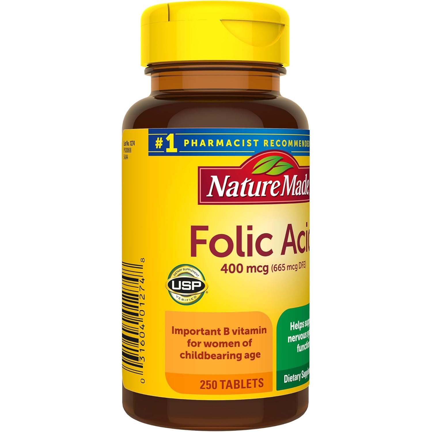 - Nervous system support supplement: contains one 250 count bottle of Nature Made Folic Acid 400 mcg (665 mcg DFE) Tablets for a 250-day supply