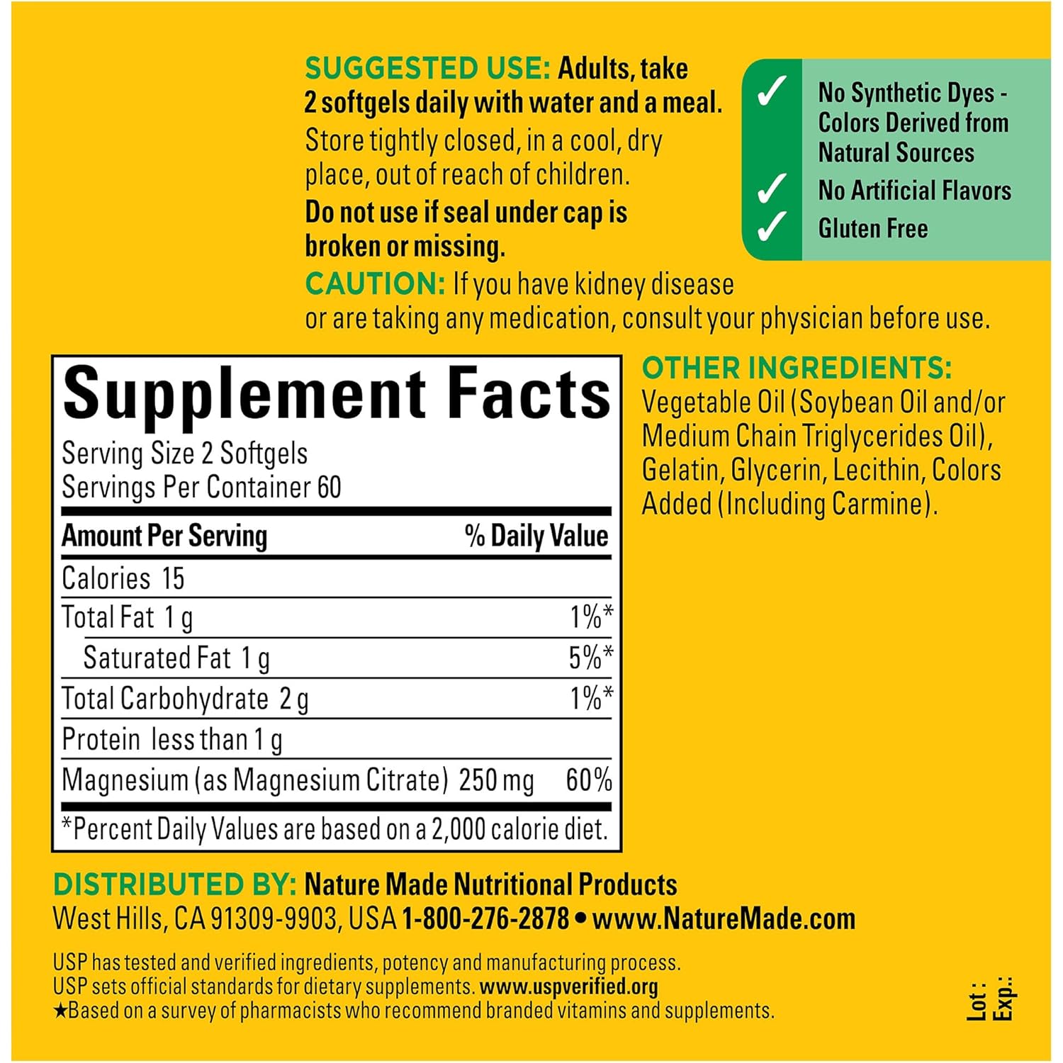 - Nerve, bone and heart support supplement: contains one 120 count bottle of Nature Made Magnesium Citrate 250 mg per serving Softgels for a 60-day supply