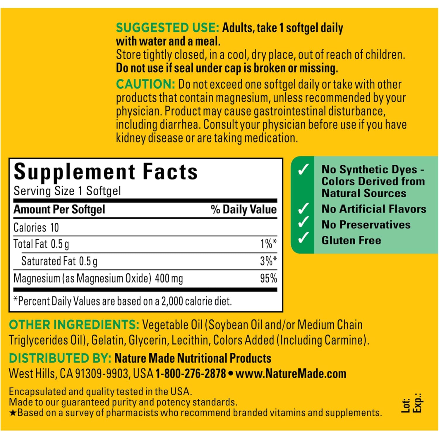 - These gluten free Nature Made Magnesium Extra Strength 400 mg softgels have no synthetic dyes, no artificial flavors, and no preservatives