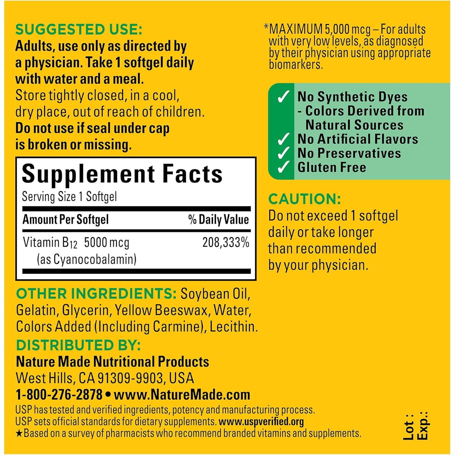 - Energy metabolism support supplement(1): contains one 60 count bottle of Nature Made Maximum Strength Vitamin B 12 5000 mcg Softgels for a 60-day supply