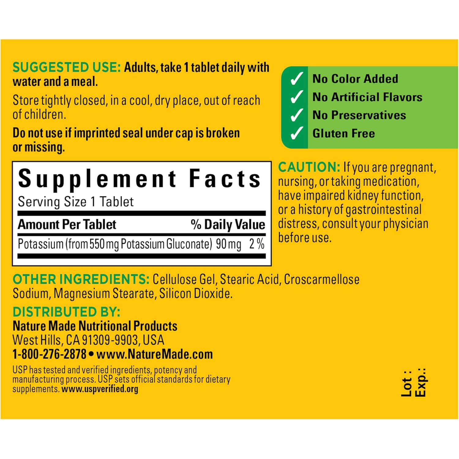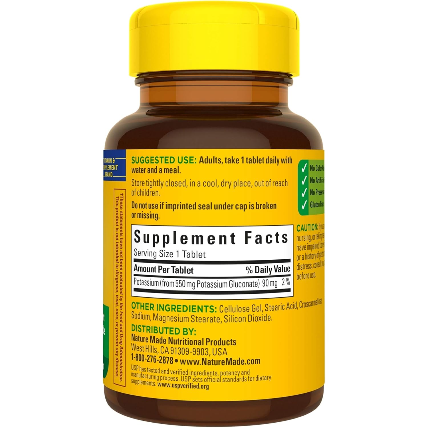 - Heart health support supplement: contains one 100 count bottle of Nature Made Potassium Gluconate 550 mg Tablets for a 100-day supply
