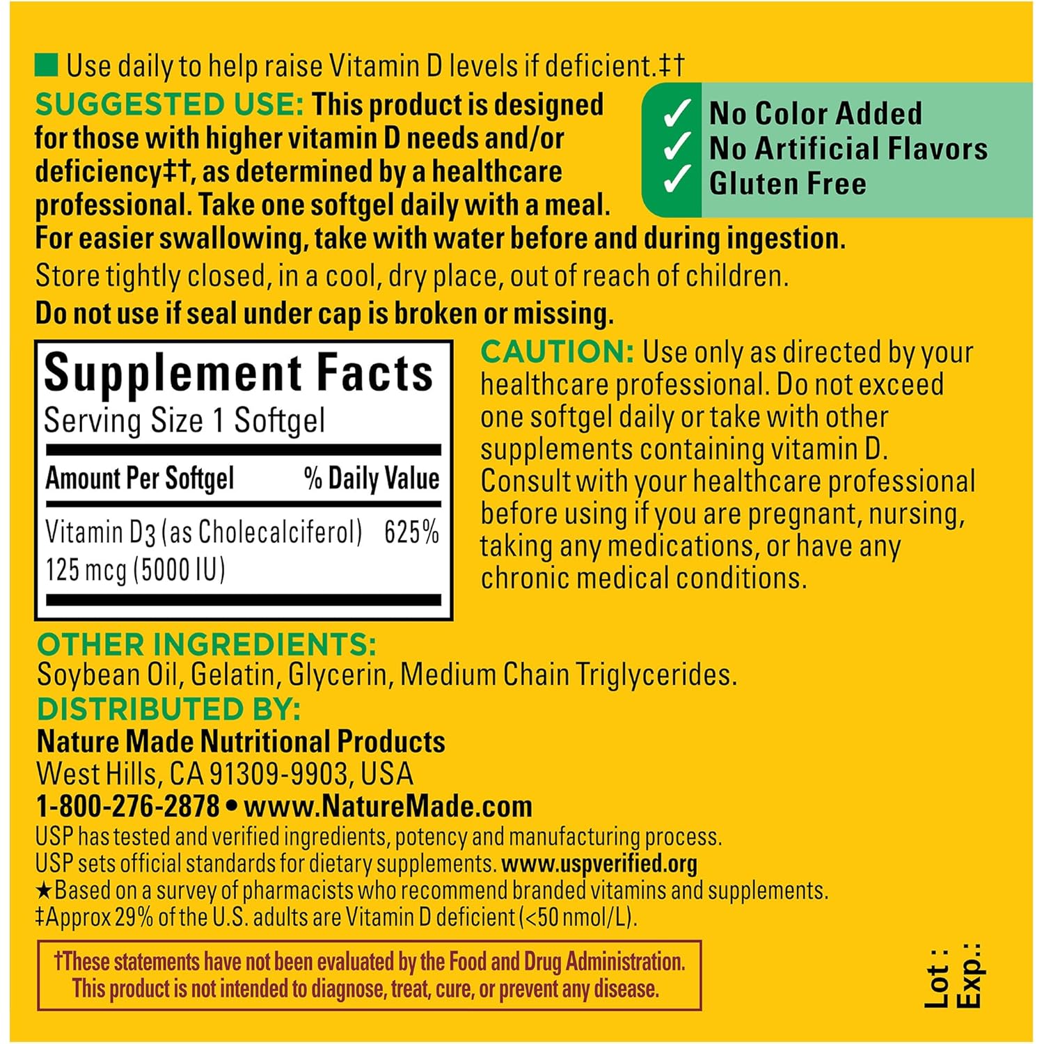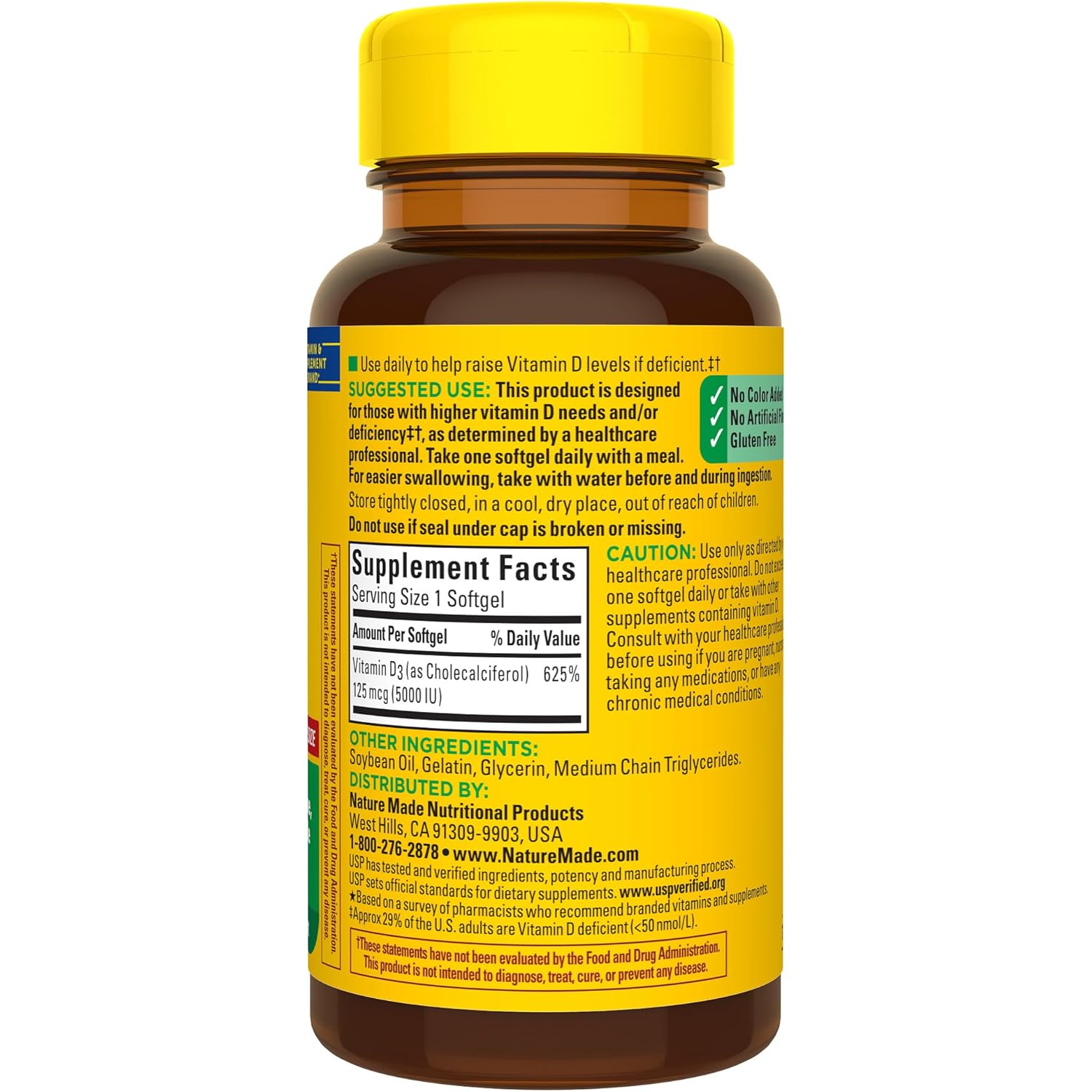 Nature Made Vitamin D3 5000 IU (125 mcg) Softgels, Extra Strength Vitamin D Supplement for Bone and Immune Health Support, 180 Count, 180 Day Supply