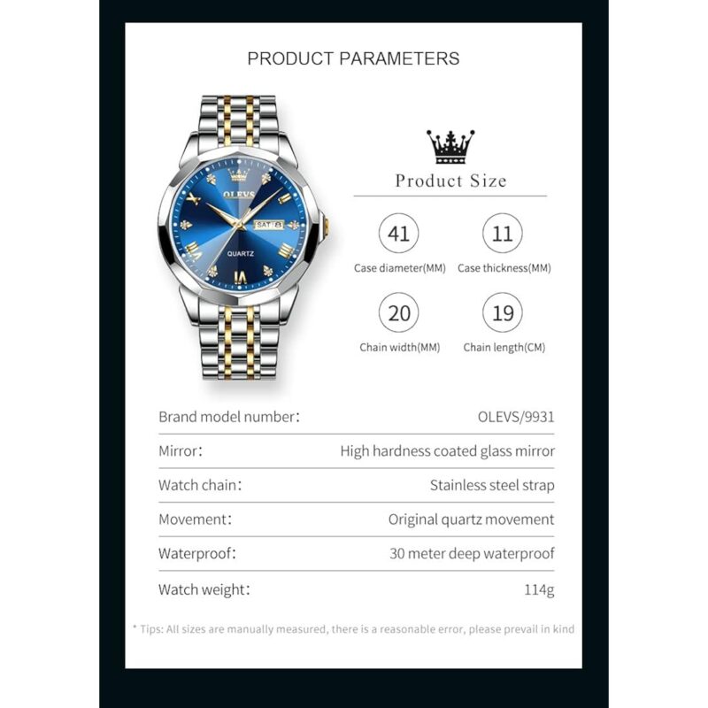 • ⌚OLEVS Men Watches: Male watch come with olevs brand box.we offer a 30-day free return period and a 1-year warranty period are also provided. If you encounter problems during the use of the two tone silver watch, you can contact us through Amazon.