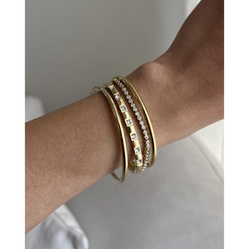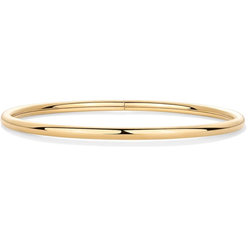 - Make a statement the second you walk in the door in this bangle duo. The bangles are 14K yellow gold plated stainless steel and are Small/Medium (57mm inner diameter, 62.6mm outer diameter, 2.8mm thickness). This 2-pack of bracelets makes the perfect beginner stack or can be worn on separate wrists for a balanced look.