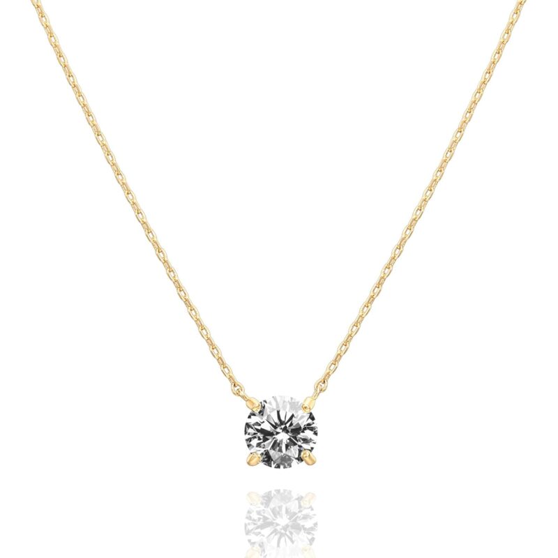 - HIGHLIGHTS: A 7.3mm cubic zirconia crystal is prong-set in a 14K yellow gold-plated setting to complete this small pendant. It is 18″ in length with a 2″ extender. This jewelry for women will comfortably fit all neck sizes.