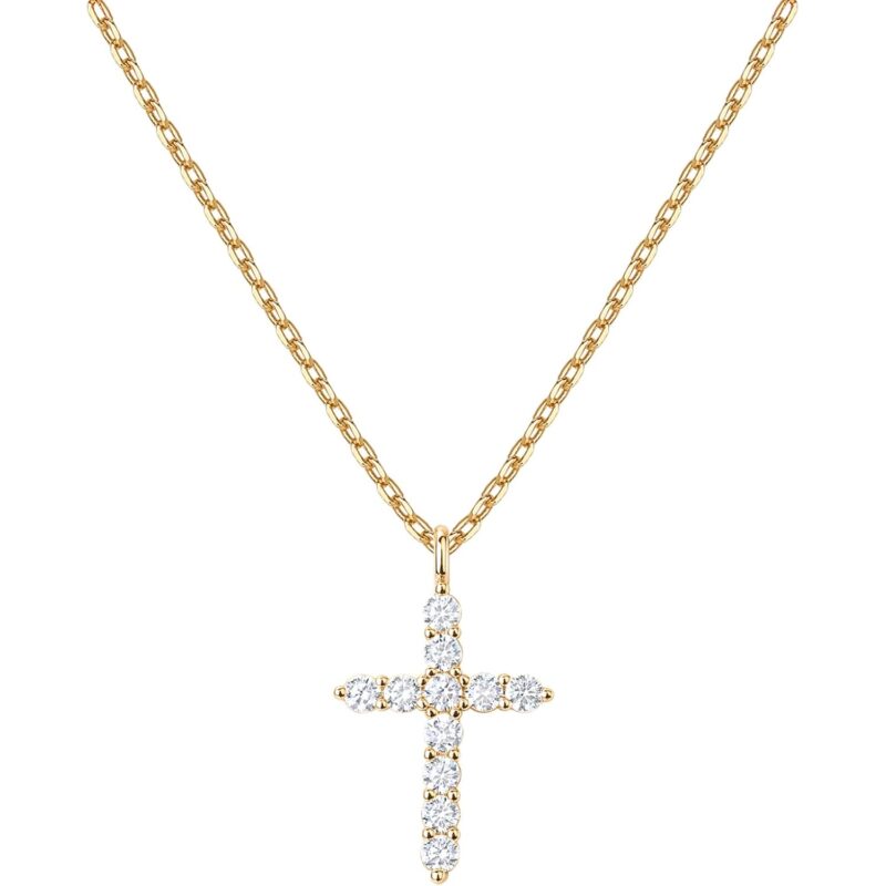 - HIGHLIGHTS: This women’s cross-shaped faith necklace is crafted from hand-selected AAAAA-quality cubic zirconia and plated in 14K yellow gold. It features a 19-inch sliding chain that comfortably fits all neck sizes.