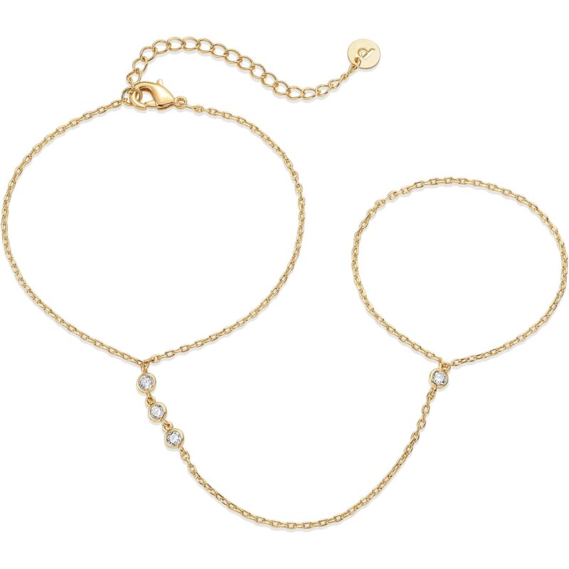 - Break away from basic bracelets and amp up your look with this hand chain from wrist to finger. The subtly sweet and dainty 3-inch 14K yellow gold plated chain meets premium AAAAA Cubic Zirconia stone accents for simple sophistication in your everyday outfits.