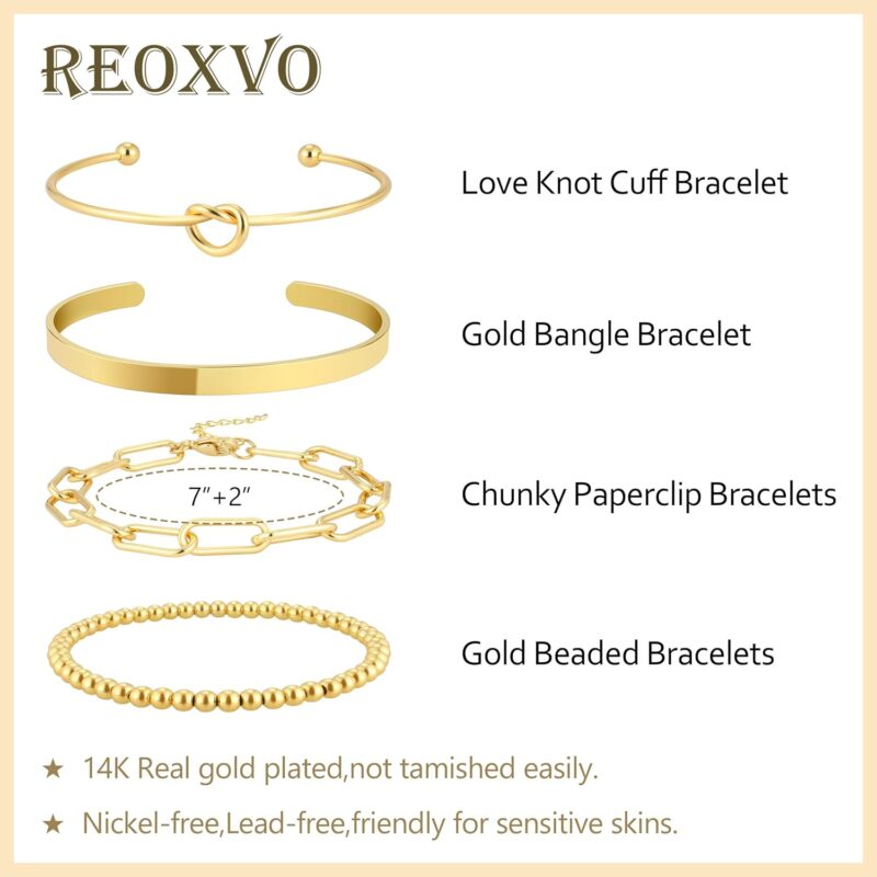 - You Will Get 4pcs Different Style Bracelets With Love Knot Bracelets,Bangle Cuff Bracelet And Gold Stretch Beaded Bracelets With Flexible/Adjustable 6.5inch, And 7inch Chunky Paperclip Link Chain Bracelets With 2inch Extender