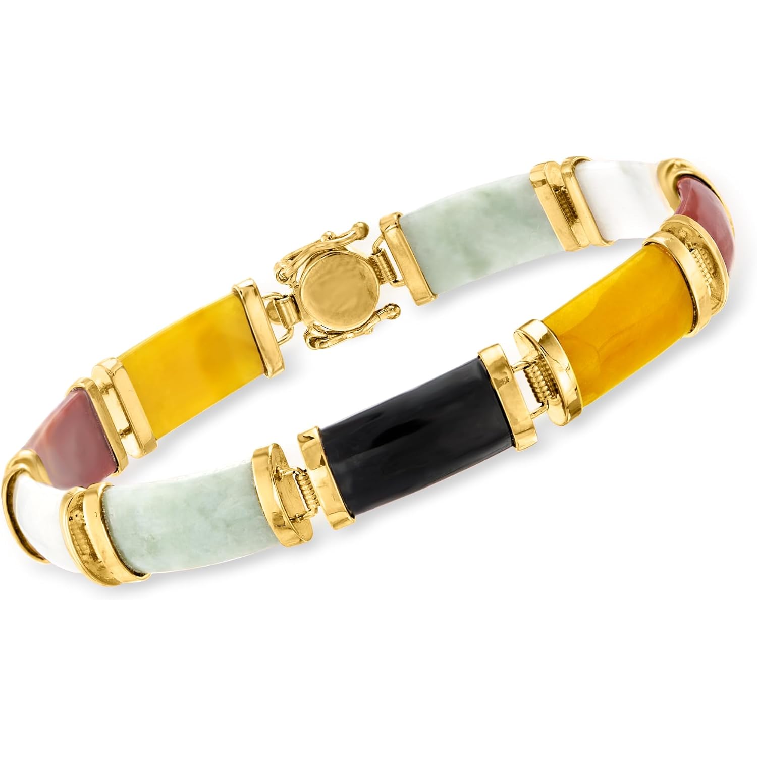 - MULTICOLORED JADE AND 18KT GOLD OVER STERLING — Multicolored jade “good fortune” bracelet in 18kt yellow gold over sterling silver. 16x8mm white, green, black, yellow and red carved jade. Polished finish. 7 1/2 in. long. 1/4 in. wide. Figure 8 safety. Box clasp features the Chinese symbol for “good fortune.”