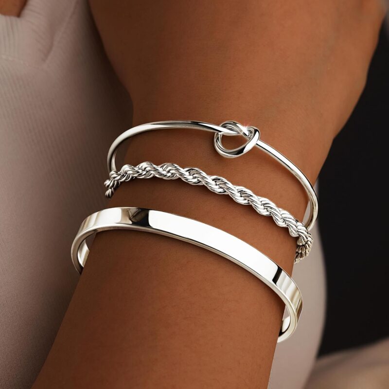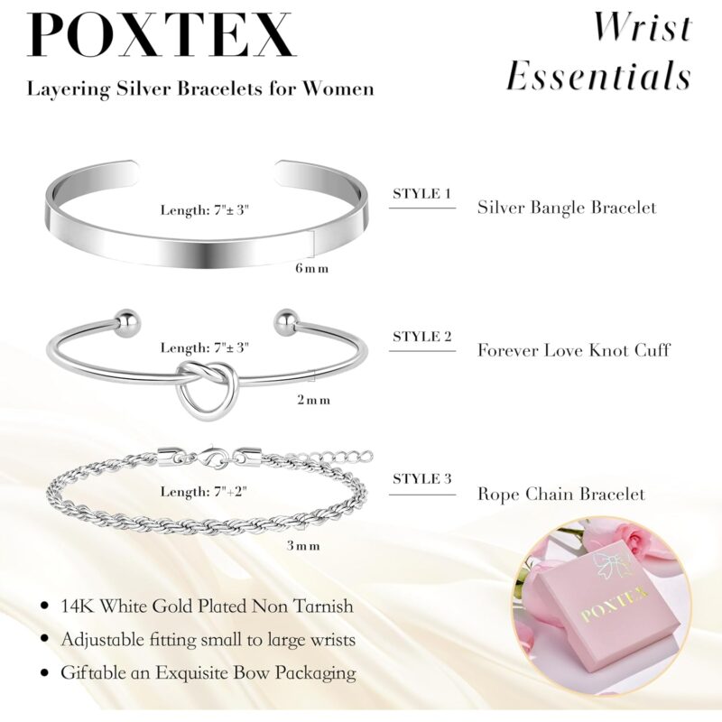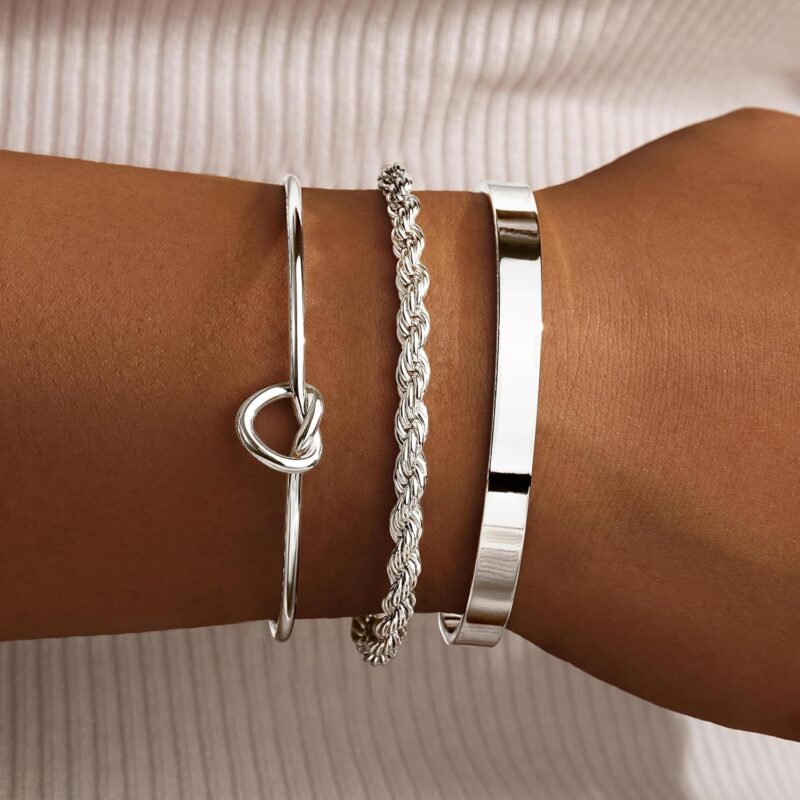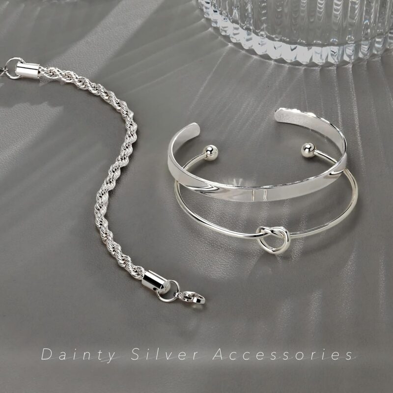 - 3 Fashion Trendy Wrist Essentials: Our silver bracelet set have various styles, silver Bangle Bracelet, Forver Love Knot Cuff and Rope Chain Bracelet. You can wear by itself or with other bracelets to transform any outfit