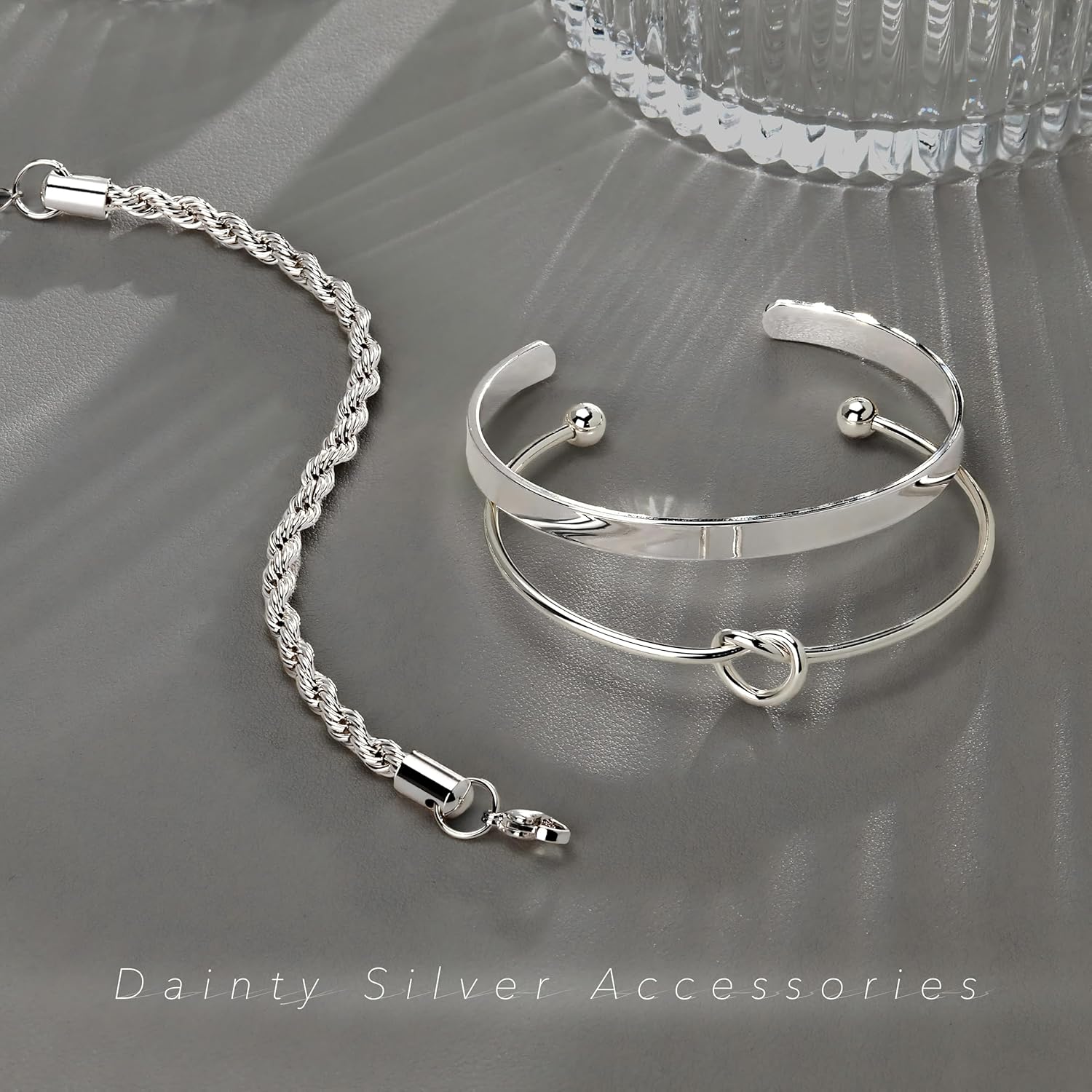 • 3 Fashion Trendy Wrist Essentials: Our silver bracelet set have various styles, silver Bangle Bracelet, Forver Love Knot Cuff and Rope Chain Bracelet. You can wear by itself or with other bracelets to transform any outfit