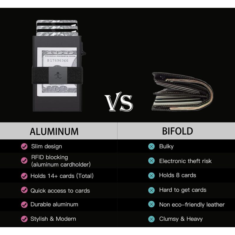 💳 ULTRA THIN PROFILE (SLIM WALLET FOR MEN): The minimalist tactical wallet is very thin and can be carried comfortably in a pocket. The aluminum cardholder size is 3.9*2.5*0.5in,weight only 2.6oz. And expandable backplate designed for additional storage. Ditch the bulk, less is more.