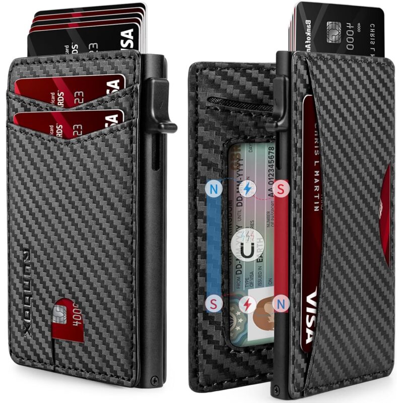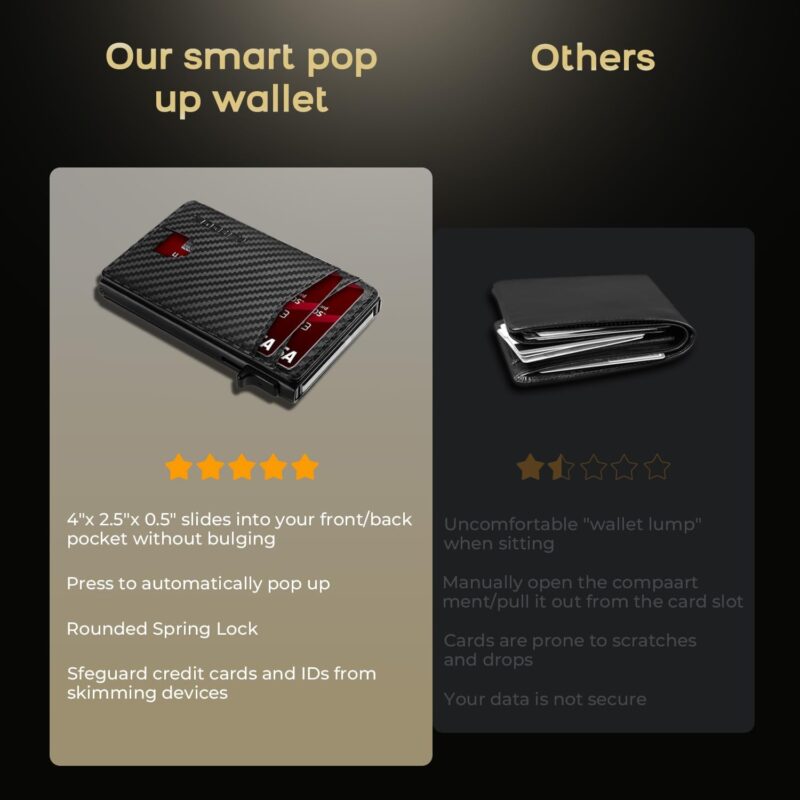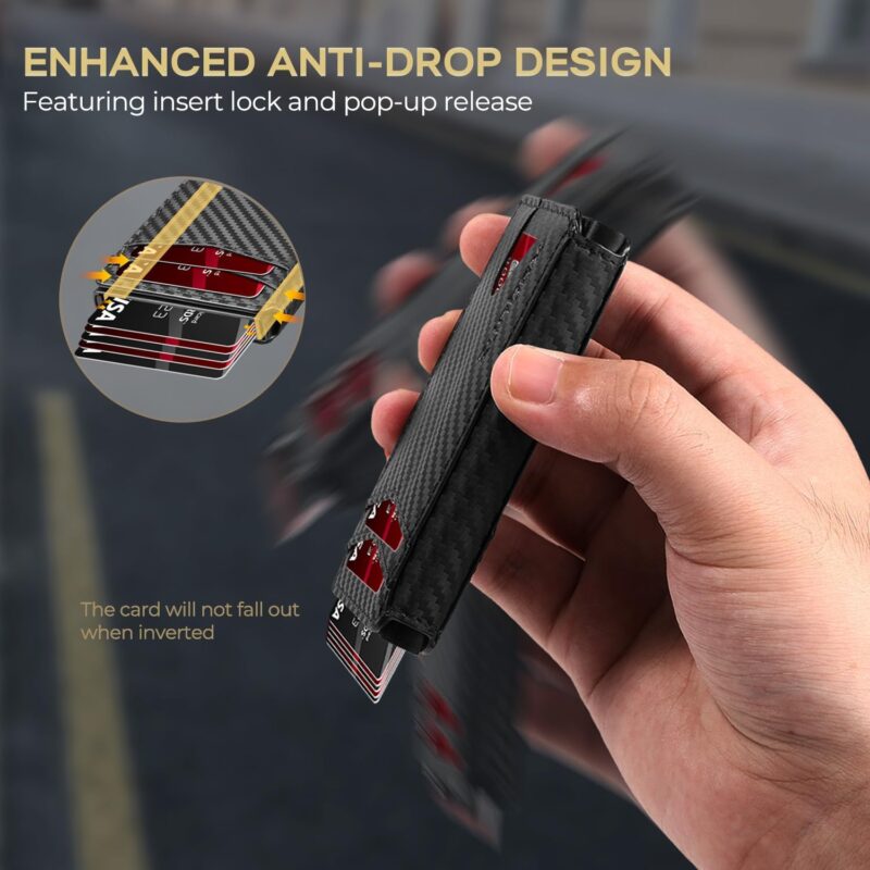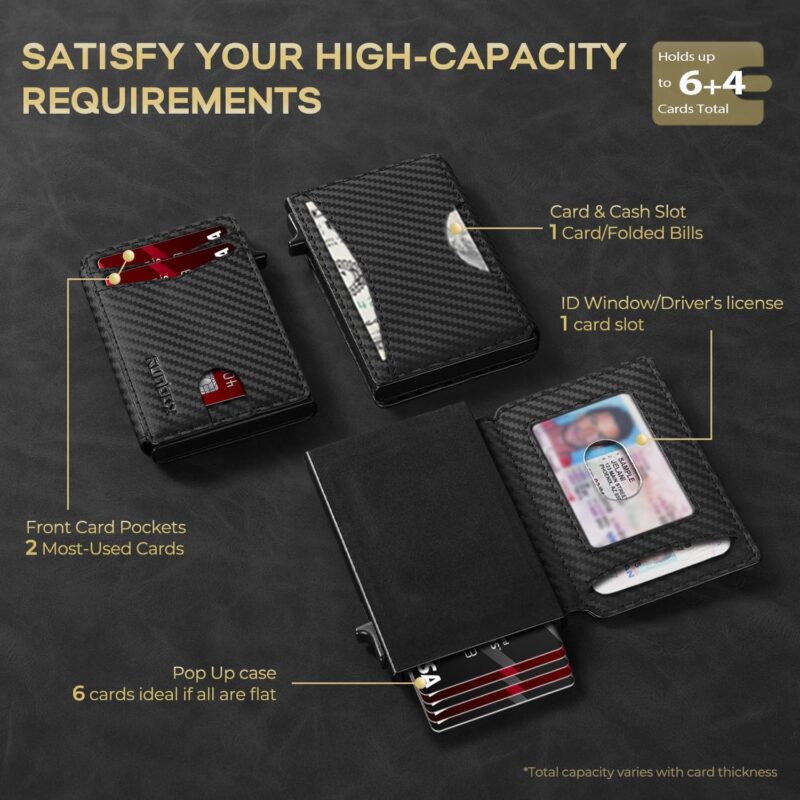 QUICKEST ACCESS: Get instant card access with just one hand by tapping a button. The front pocket holds your 2 most-used cards, while the pop-up aluminum card holder stores 1-6 cards (The actual capacity depends on the card thickness ) . Features an ID window for your driver’s license and a back pocket that fits one card or cash