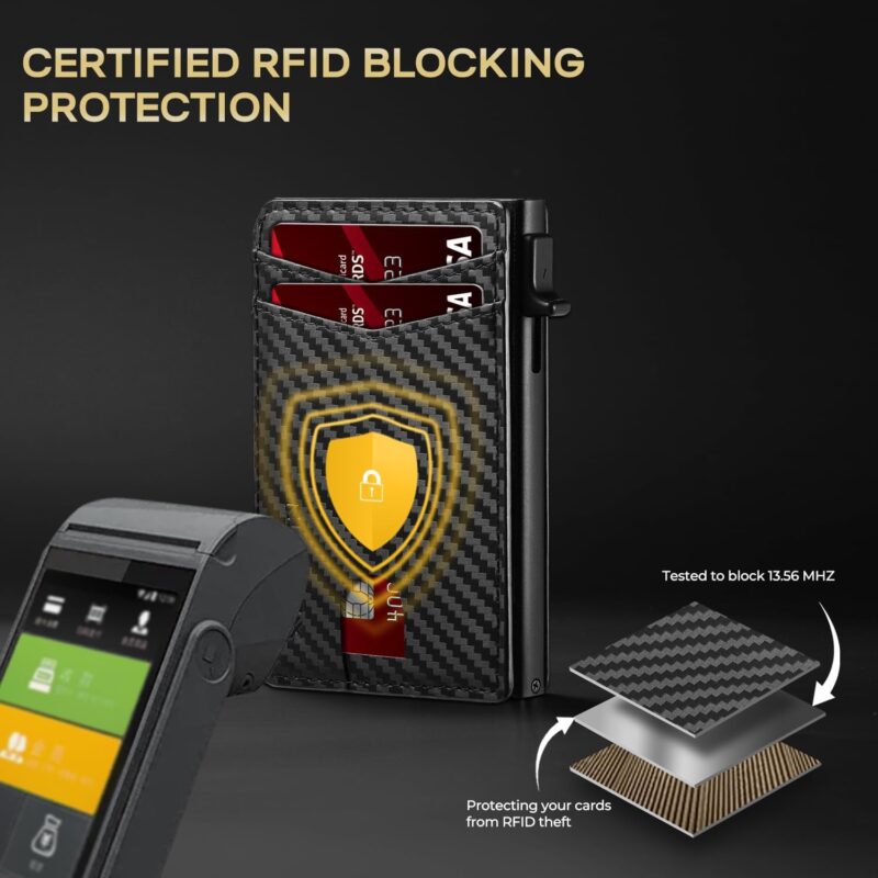 Military-Grade RFID/NFC Protection: Built with solid aluminum shielding, this smart wallet blocks 13.56MHz signals to prevent digital theft. Safeguard credit cards and IDs from skimming devices – your data stays secure